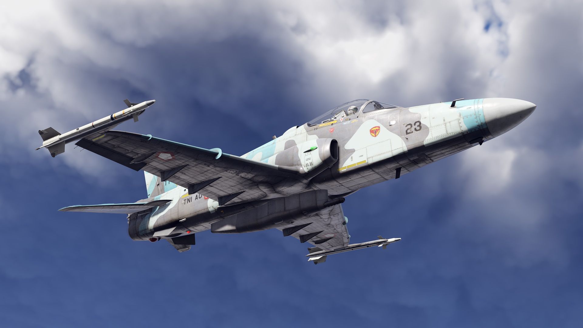 The primary difference between this Indonesian variant and the regular Hawk 200 is the armament. The internal cannons have been removed, but don’t worry! A 30 mm cannon pod has been mounted on the central pylon under the fuselage to fend off aircraft and light targets. The bulk of the Hawk 209’s arsenal consists of bombs. You’ll be able to choose from many options, from 250, 500, and 1000 lb, along with classic FFAR unguided rockets.