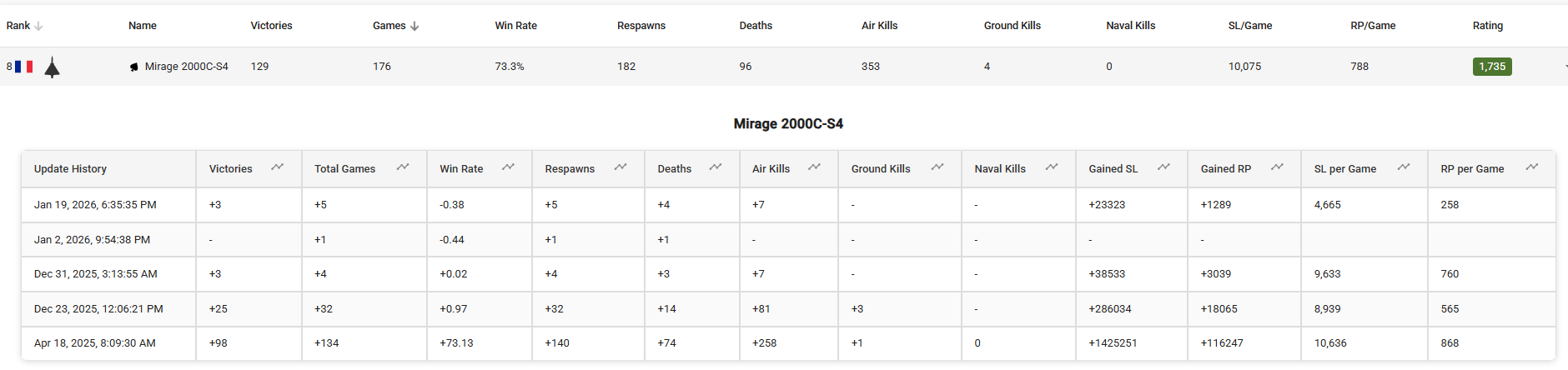 You’re trying to get me started on the Mirage 2000C S4 and MiG-21 Bison (that you don’t have),… but looking at your single stats: