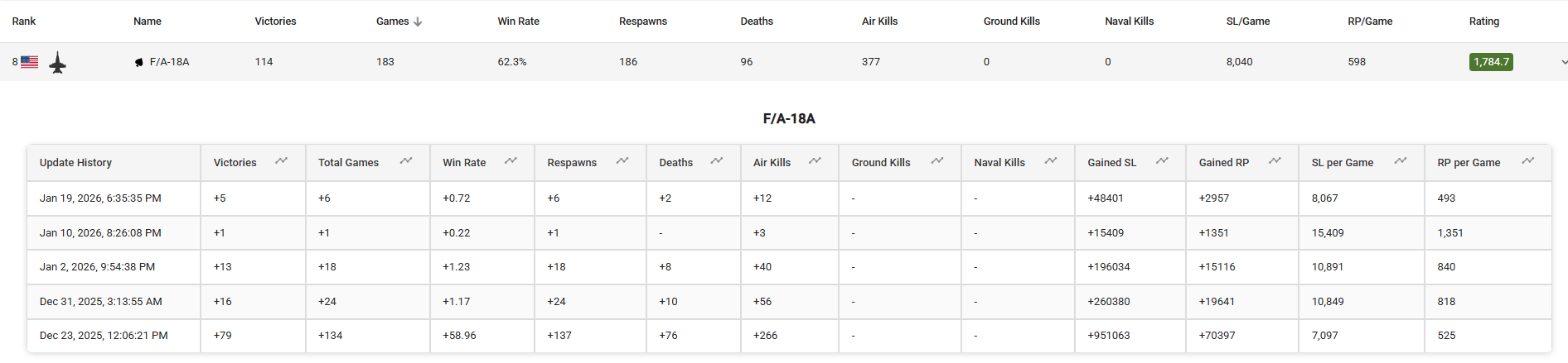 That is just my personal statistic; it is not reliable reference data. And even if you base your judgment on it, their kills per game are almost identical, even though the Migrate 2k has four fewer IRs than the F-18A… Other stats depend heavily on the matchmaker.