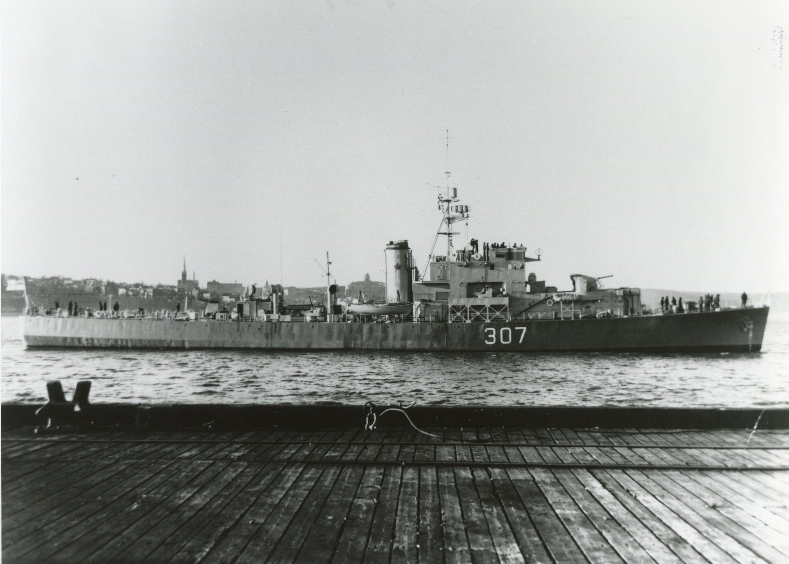 Ordered on the 1st of February 1943, she was laid down by the 20th July the same year by Davie Shipbuilding, in Lauzon, Quebec. She launched on the 22nd June 1944, commissioning on the 13th of September 1944. However she was damaged and had to undergo repairs at Halifax, she only finished fitting in January 1945 at Bermuda.