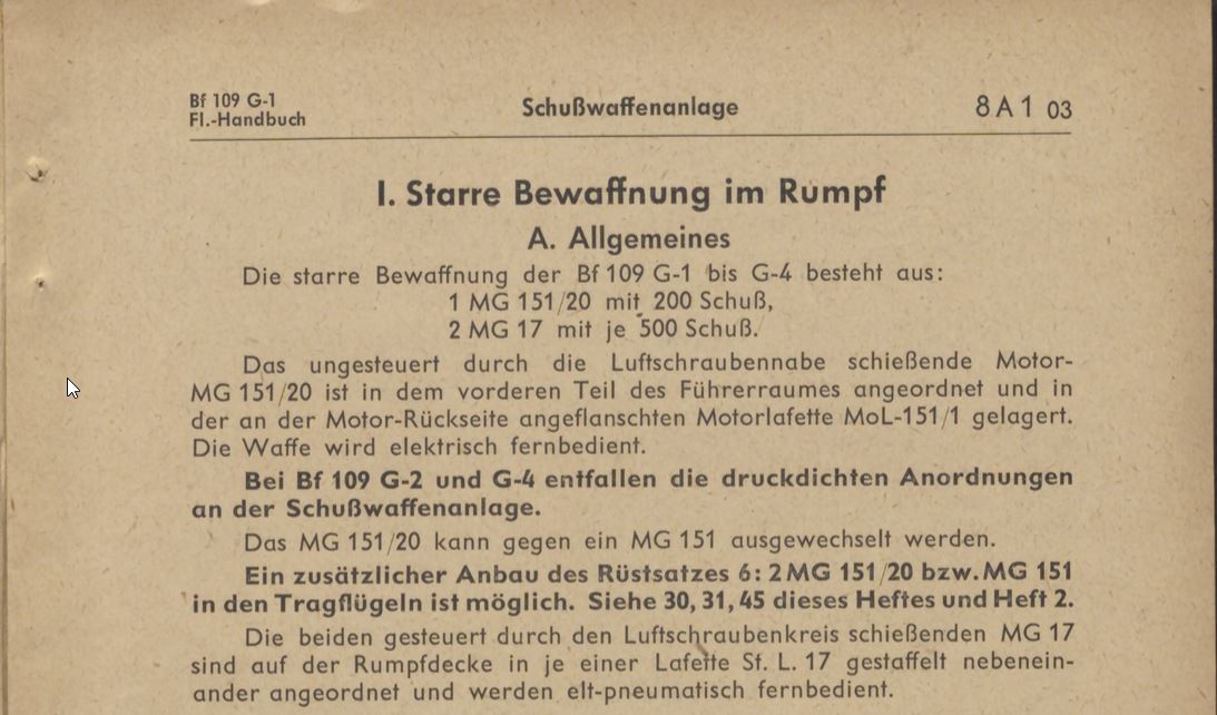 Also noted in the Bf 109 G-1 weapon manual that the MG 151/20 can be swapped to the MG 151, as well as having MG 151/20 or MG 151 gun pods.