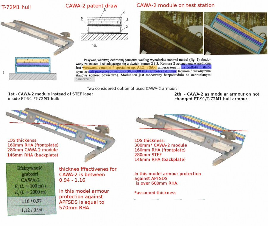 We actually know what might be there. As part of the contract with Bumar Łabędy S.A., Malaysia had the choice of retaining the standard M1 armor with glass-reinforced textolite or opting for the already well-known CAWA-2 ceramic armor. Testing concluded around 1998 and was intended for use in the next modernization of the PT-91 PT-97 tank, but this never materialized. Returning to the topic of the new PT-91s, it was originally planned to replace the textolite in the hull without changing the turret armor due to the cost of such an operation. It’s also worth mentioning the rumors about using a new type of high-strength steel plate, 16mm thick (replacing the one currently installed). Unfortunately, we don’t know if Malaysia opted for this solution, as this information is classified. However, if the tanks for Malaysia are equipped with CAWA-2, these tanks will shine with excellent protection exceeding 550-570mm of RHA without the use of ERAWA-2 cubes above it! Which is quite impressive considering that in the book A.Wiśniewski stated that CAWA-2 should be used in par with ERAWA-2 in this configuration this tank would out perform T-72B hull armour by quite a bit and at the same time it would have access to the new FCS, a better engine and an impressive reverse gear which especially in warthunder matters a lot. All this information comes from colonel A.Wiśniewski book from 2002 Amunicja i pancerze he was in charge in making the Ceramic Armour Wiśniewski Adam (CAWA-1/2) and Explosive Reactive Armour Wiśniewski Adam (ERAWA-1/2).