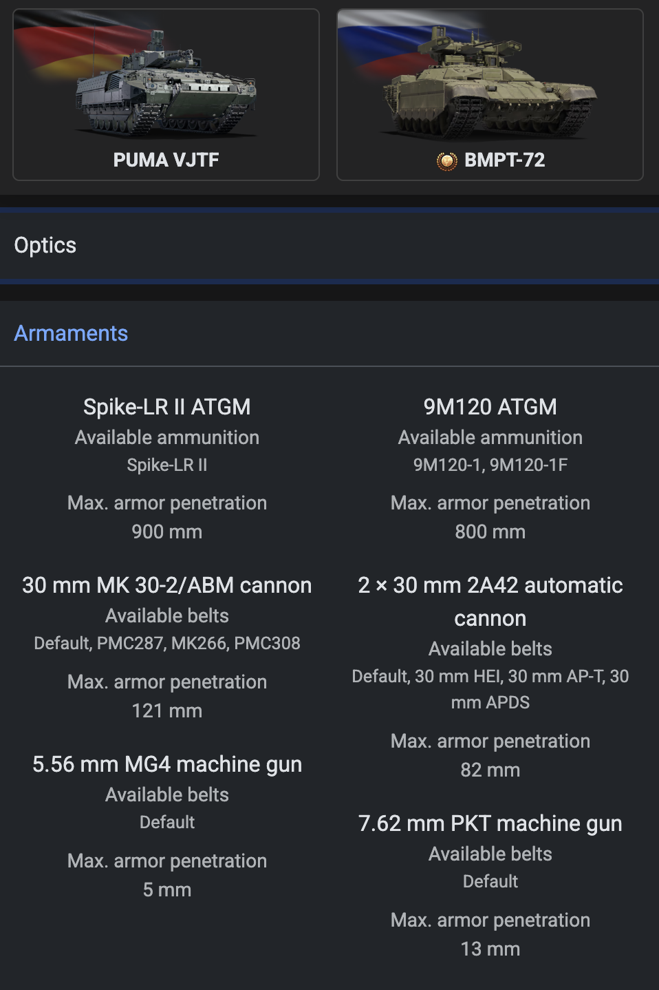 Hello, i just wann start a discussion or want a good explenation why the Puma IFV from germany is on 11.0 but the BMPT is on 10.3 same with the 2S38. In my oppinon are those vehicels way better then the Puma in every aspect.