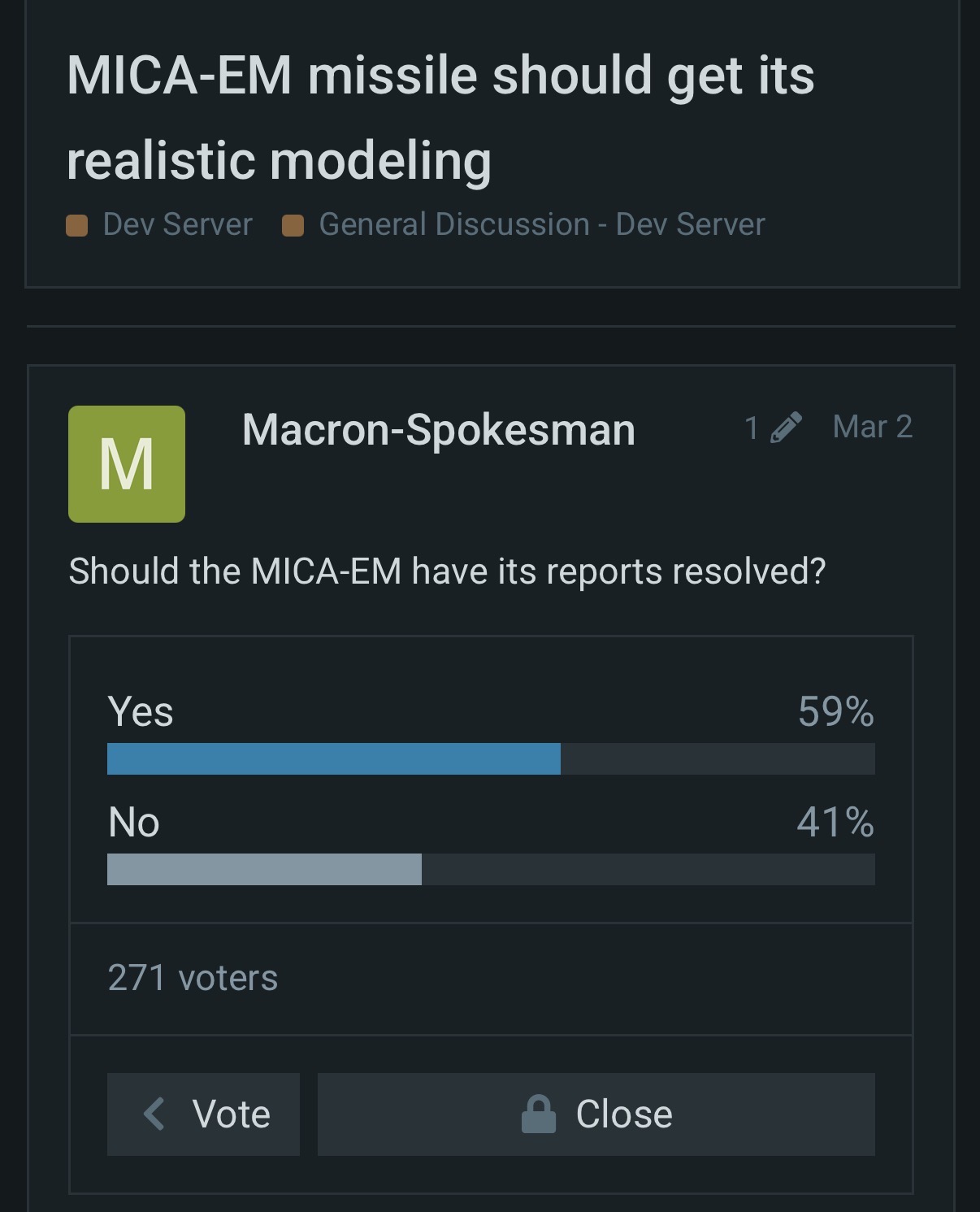 There are bug reports to fix the MICA missile’s range and a thread was made to request for these changes to be implemented. A poll was done and the majority answer was “Yes” to implementing realistic modeling for MICA as the range is too short to compete in BVR.