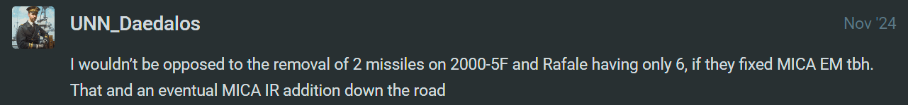 I’ve seen a grand total of 1 person from “the french community” consistently argue against the 8 MICA’s, the rest have been arguing in bad faith and actively trying to overbuff the Rafale since the dev server, so either the vast majority you’re referring to dont partake on the forums, or you’re lying to try to make the Rafale mains that have comprehensively destroyed top tier air for their own god complex look better by trying to rewrite history.