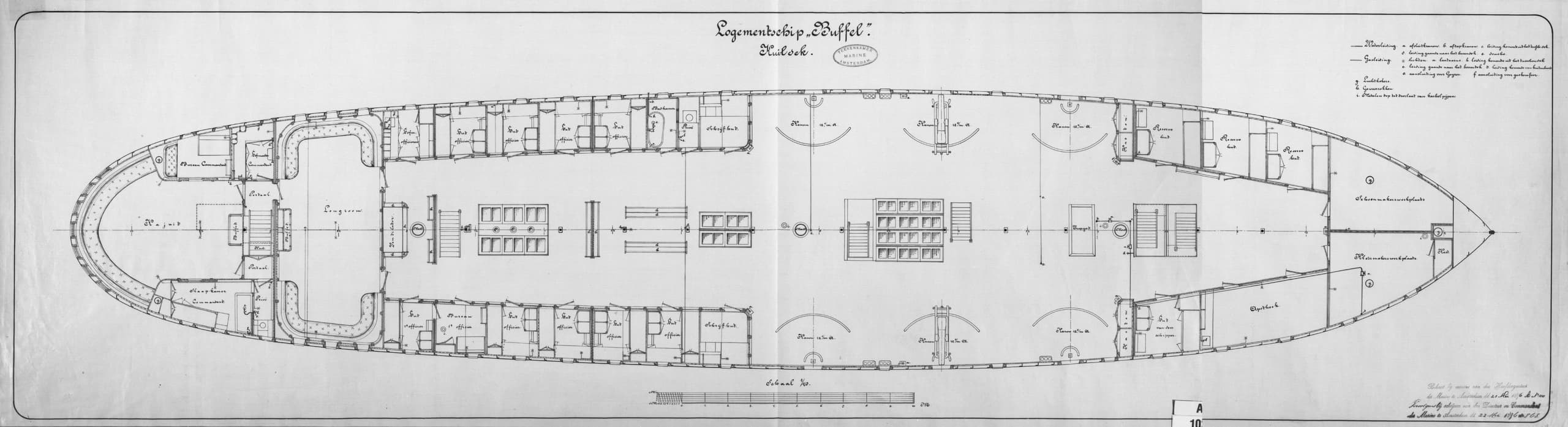 A blueprint of the “Kuildek” of HNLMS Buffel in her original lodging vessel refit. Note the six 12 cm guns