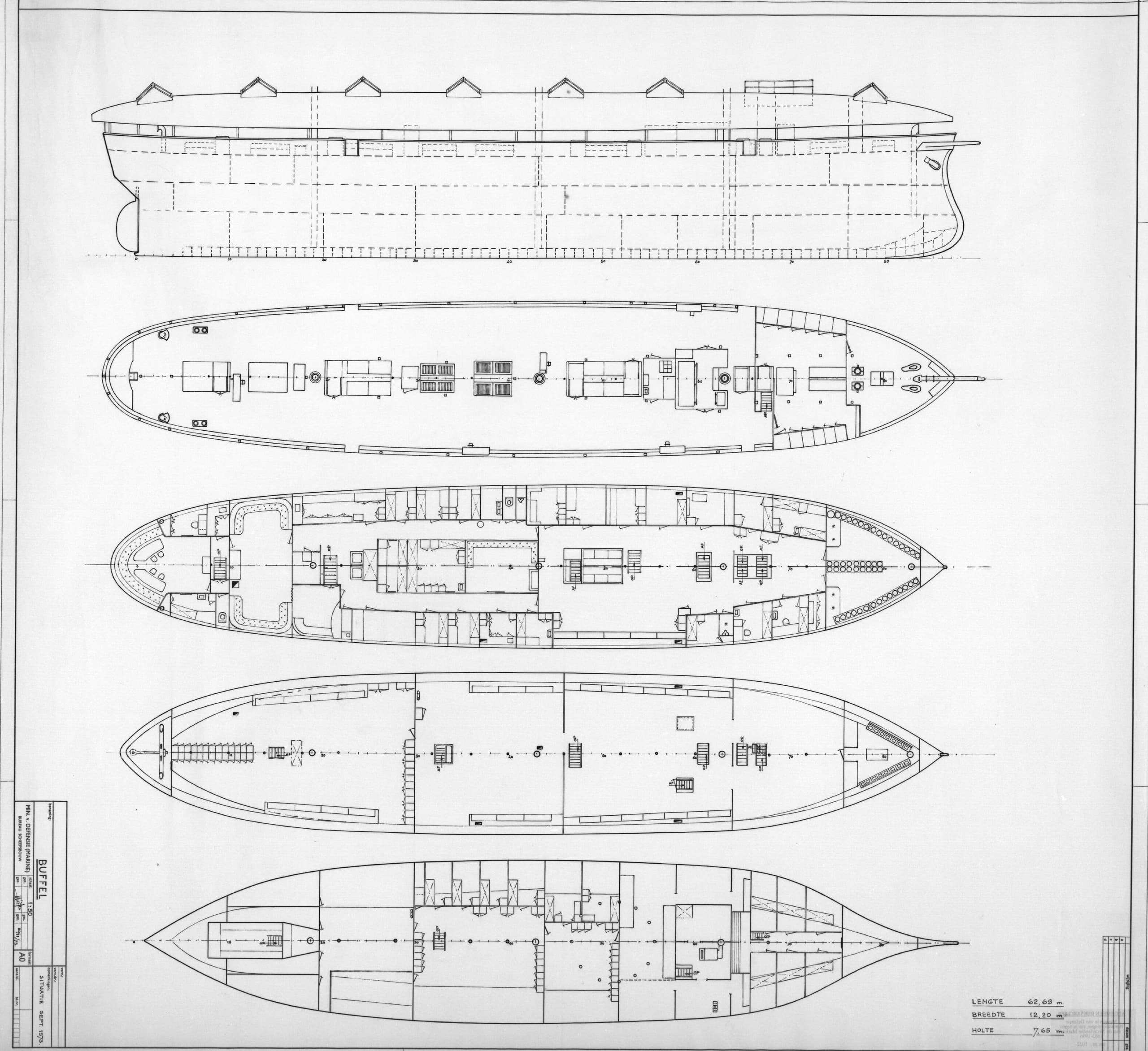 A blueprint of HNLMS Buffel in her final lodging vessel refit