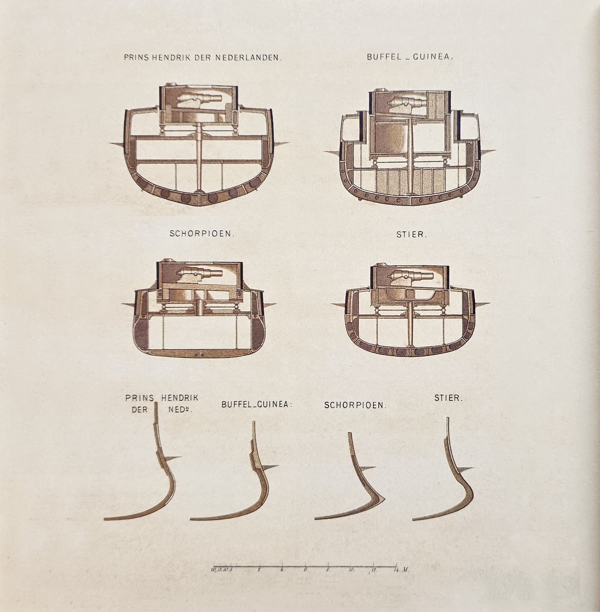 A very nice illustration showing the different hull and bow designs of different turret ram ships of the Dutch Navy. Top and bottom left is the HNLMS Prins Hendrik der Nederlanden, which is a turret ram ship 1st-class, but all the others are the turret ram ship 2nd-class. Here we perfectly see the differences between the ships. Two of the ships (Buffel and Guinea) were build at the same dockyard however, so these are the same in design.