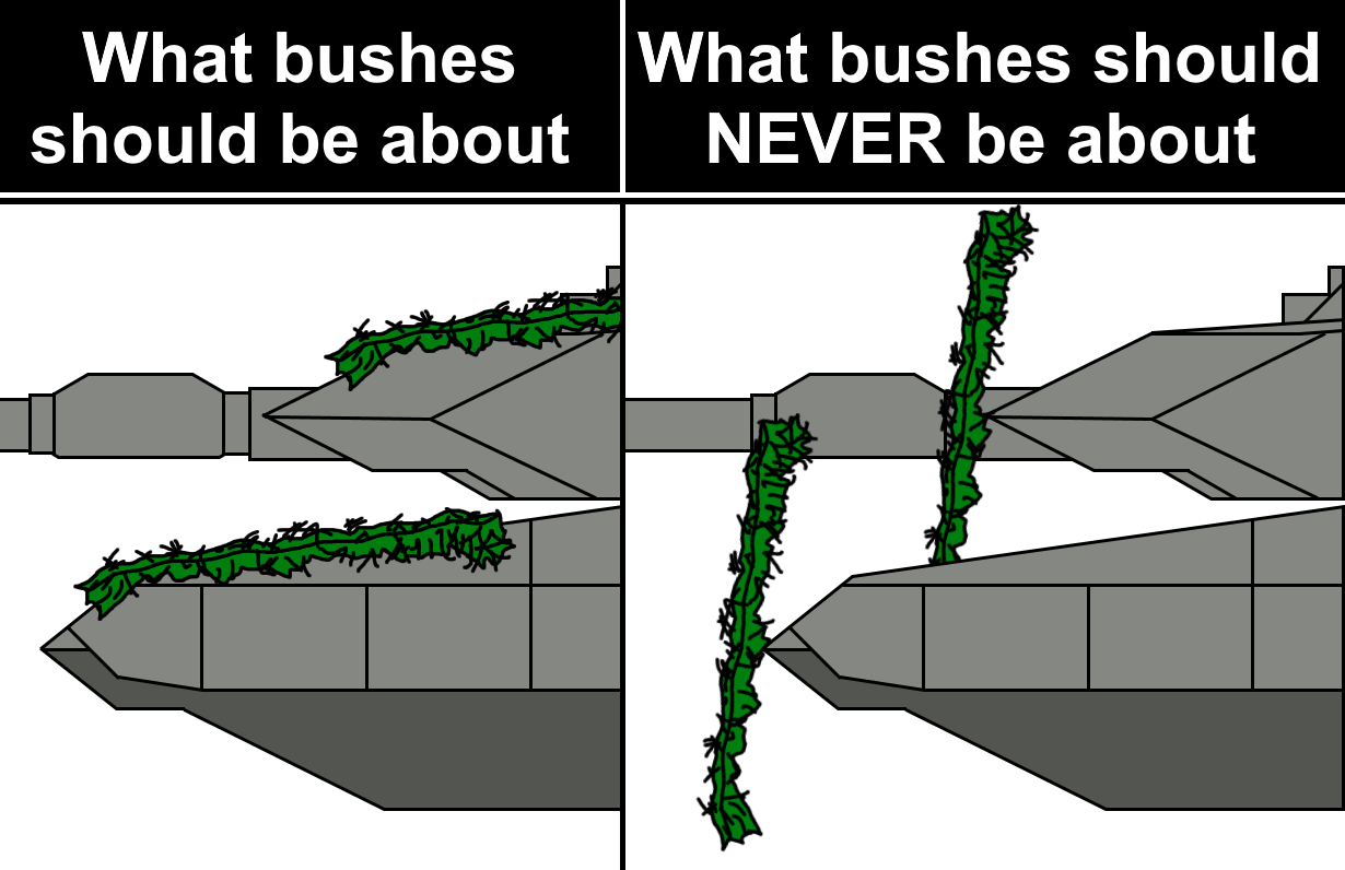 They just need to update the game engine so bushes are more dynamic. Right now it’s just a flat piece of camo that acts weird on angled plates. It should bend around the edges of the tank so I can still see where the UFP or breach is for example.