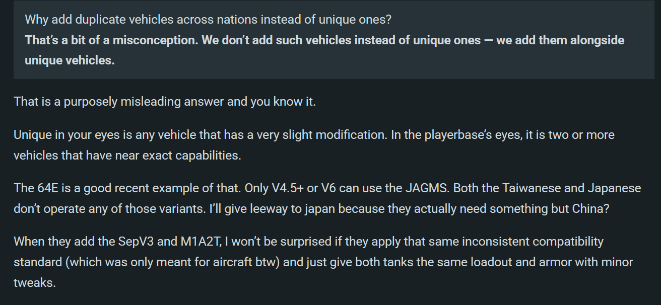 The point is Thai MUST get the VT4 that is right now operating and the mainland players need to silence now because you got the M1A2T already this is why we are raising our voices about this unfair and double standards of this topic. In the fact that the Chinese tech tree got the Paki Oplot that is not even the Oplot-P the Paki willing to operate even though they open the topic that don’t remove the OplotM just change it to propper OplotP and gaijin even avoid to change that they directly gives the Chinese tech tree the OplotM. Comparing to the Thai OplotT we have to grind to the top rank as well as research 2 previous tanks the Chinese just straight up buy the “OplotM” that not even OplotP with exact 1:1 to OplotT easily. See how double standards it is? Then global players needs to help Thai get the VT4. And then I see gaijin team avoid every answer possible about the Thai VT4 while they already added the M1A2T already this is very very double standards. I would like to say that if no Thai VT4 it should be also no Taiwan M1A2T as well. I hope my post is not flagged by community please push this up we need everyone to fight against the double standards.