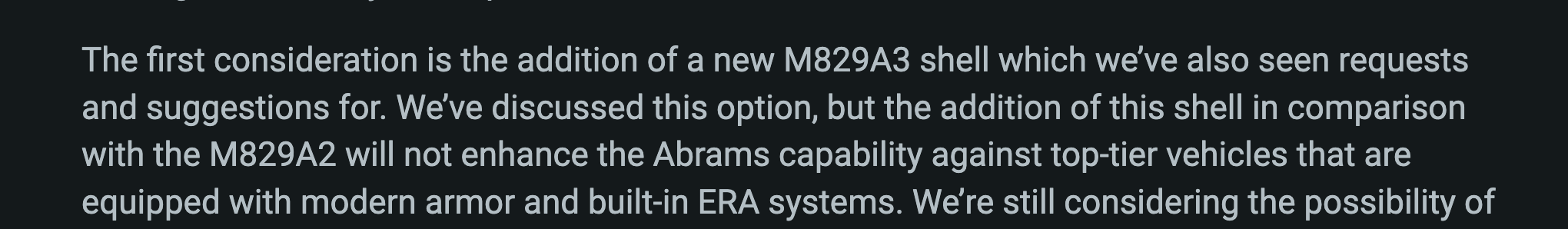 According to them, M829A3 would not change anything… yet they refuse to give it to M1A2 SEP and v2, or at least just to v2, at the very least for the sake of historical accuracy or so that they feel like actual upgrades to M1A2 and A1HC in SOME way…