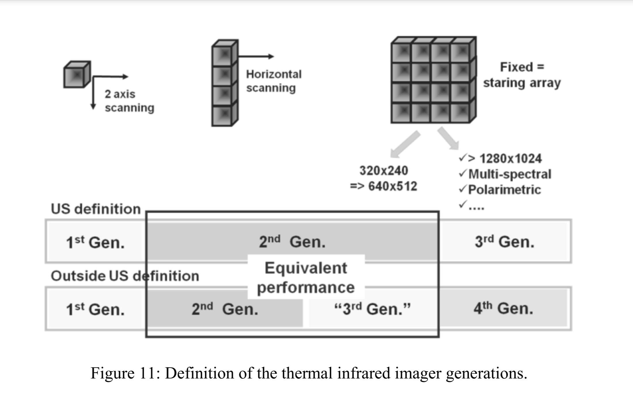 - 3rd-gen imagers are staring arrays, usually with a 2x2 micro-scanner to increase the resolution without increasing the number of elements.