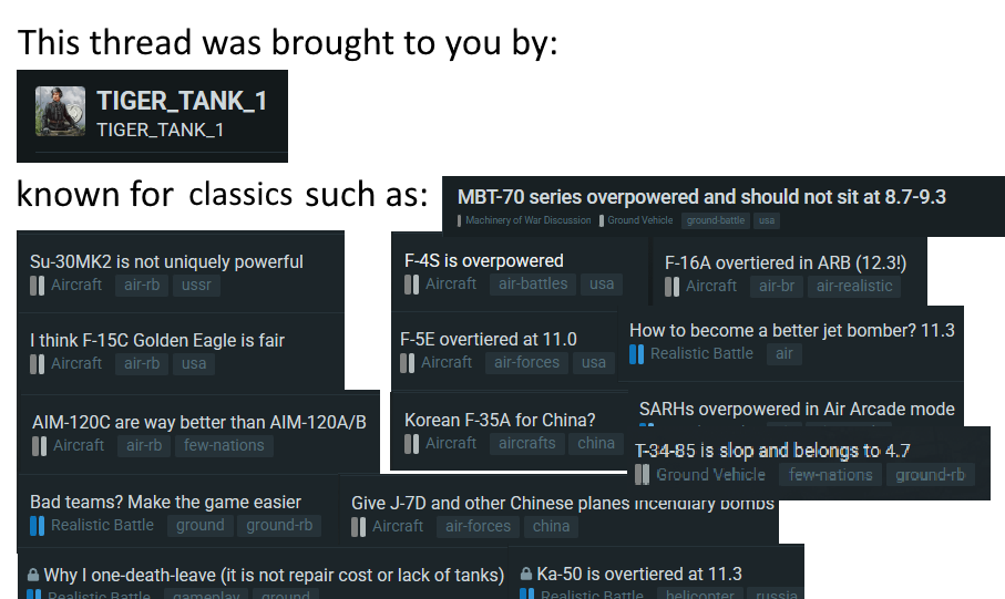 I am starting to believe that this guy just hops on the game, tries to bomb with jets or hold w right into the enemy tanks depending on the gamemode and then make a thread about whatever vehicle killed him and call it op or call the vehicle he was using bad.