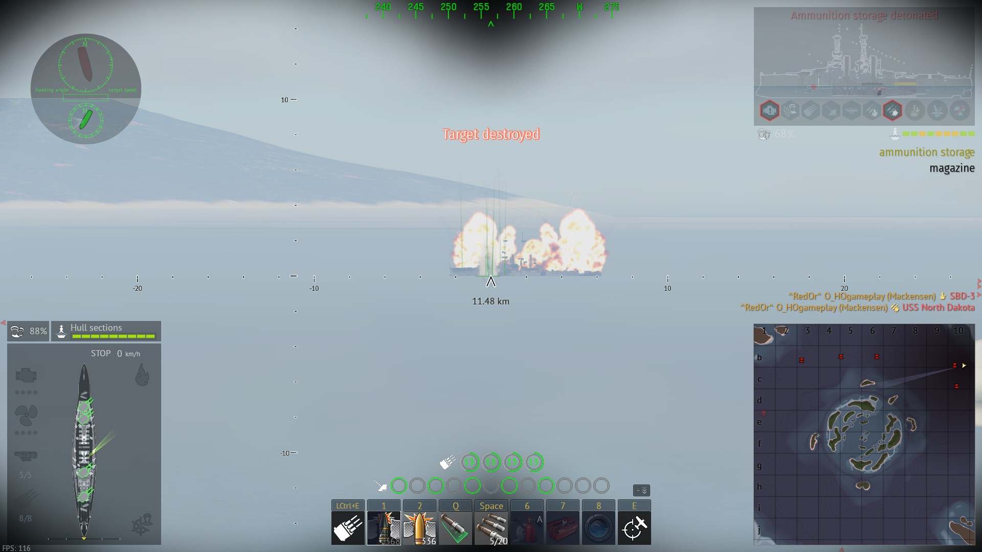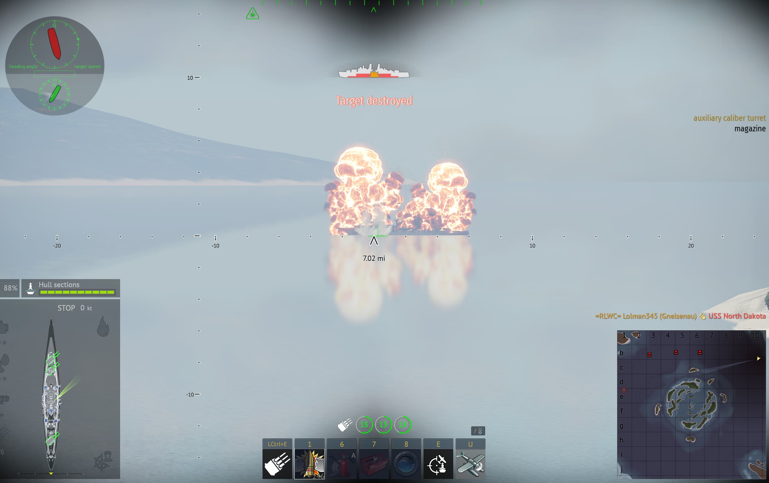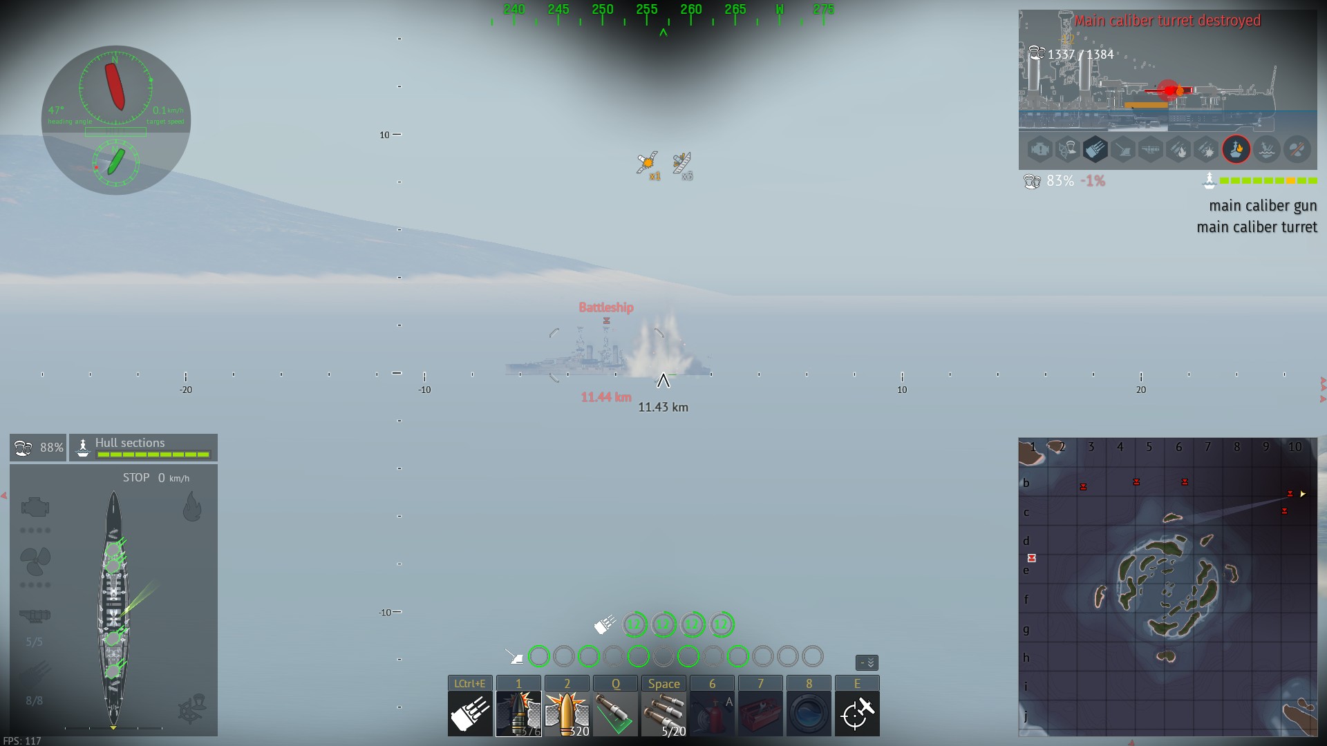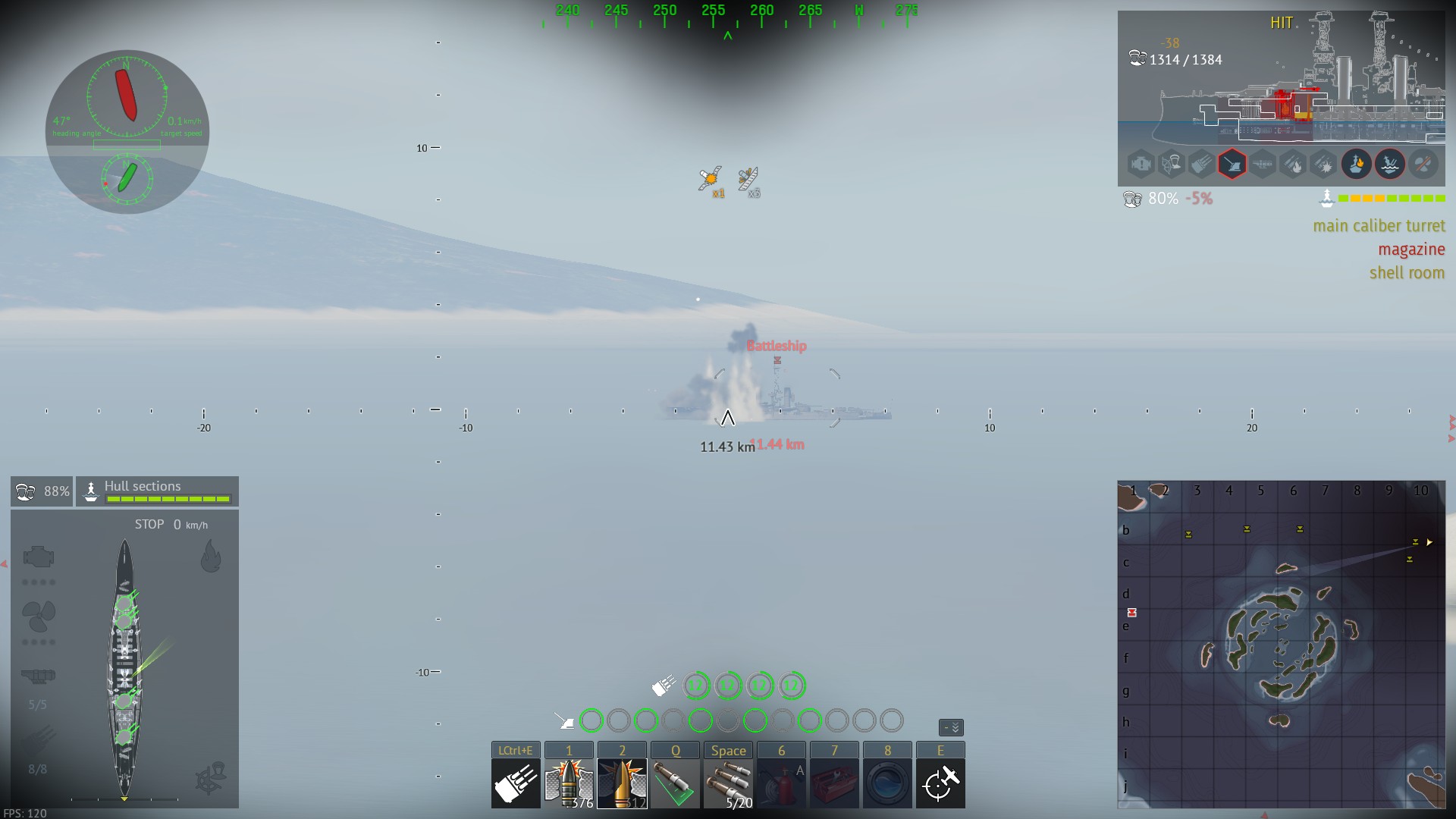 Salvo 3, APHE, 34% crew damage, fire in 2 barbettes (only 1 visible on screenshot), engine damage and engine fire. (dies to barbette fire)