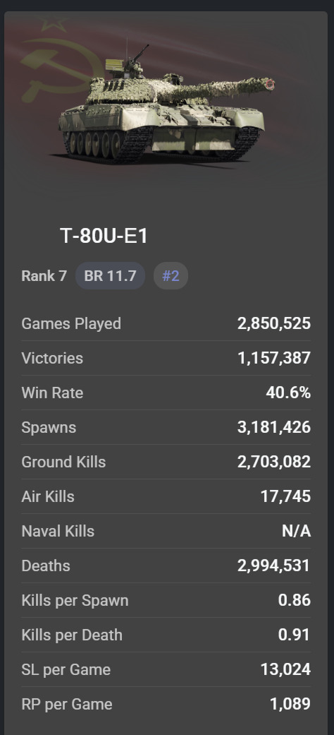 Which is what my comment was supposed to refer to. I apologize profusely that didn’t add an essay about the funny temporal mismatch between some vehicles like in air rb the Me-163 (8.0, 1944) vs the F-117(8.7, 1981) for example.