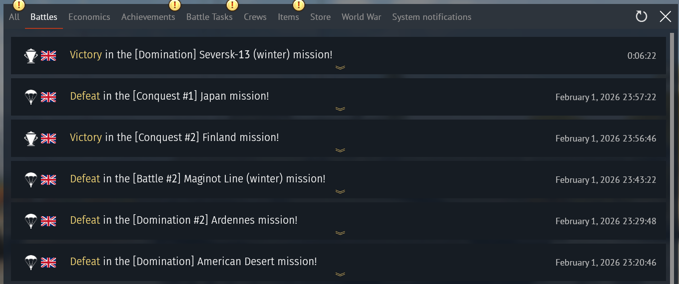 These are 6 games I played yesterday night, played my 12.0 UK lineup with all games being full uptiers to 13.0. First 3 games were all with Russia on my side, the last 3 games were all facing Russia.