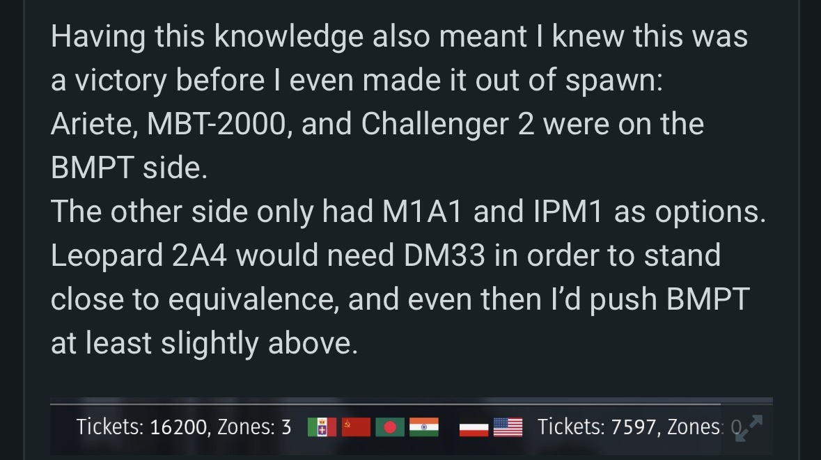 The other side only had M1A1 and IPM1 as options. Leopard 2A4 would need DM33 in order to stand close to equivalence, and even then I’d push BMPT at least slightly above.