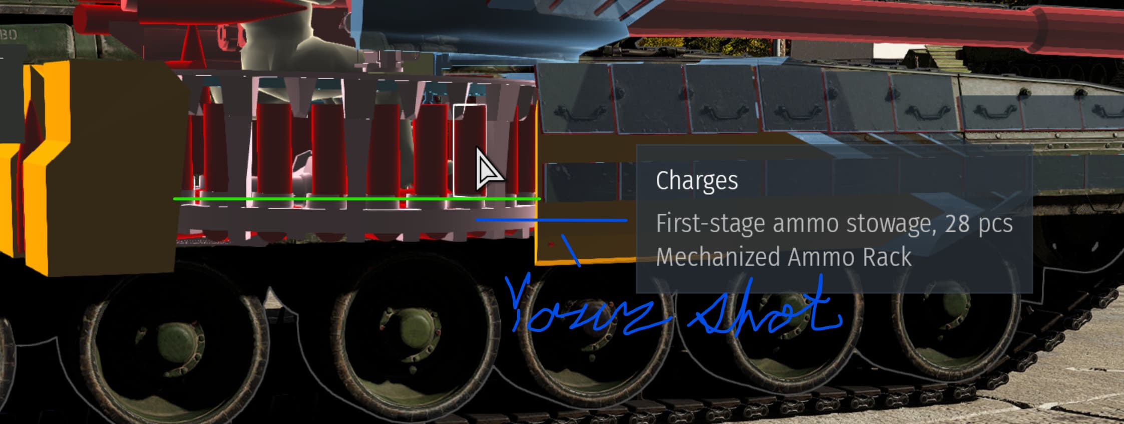 Charges also known as propellants are the ‘initial boom’ shooting the ammo out of the cannon, while the warhead is the main thing that pierce armor or explodes objects.