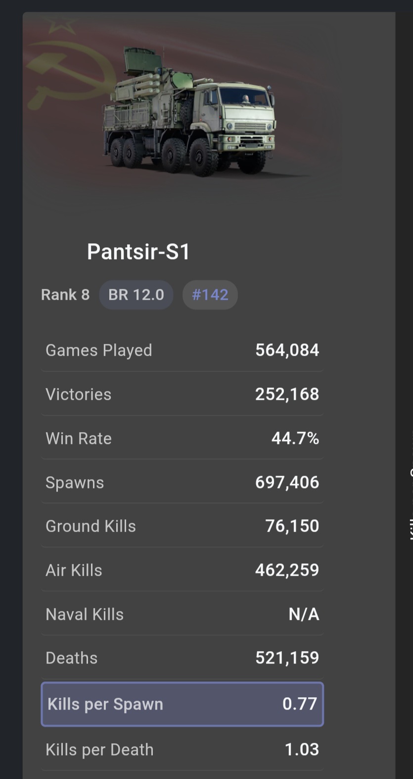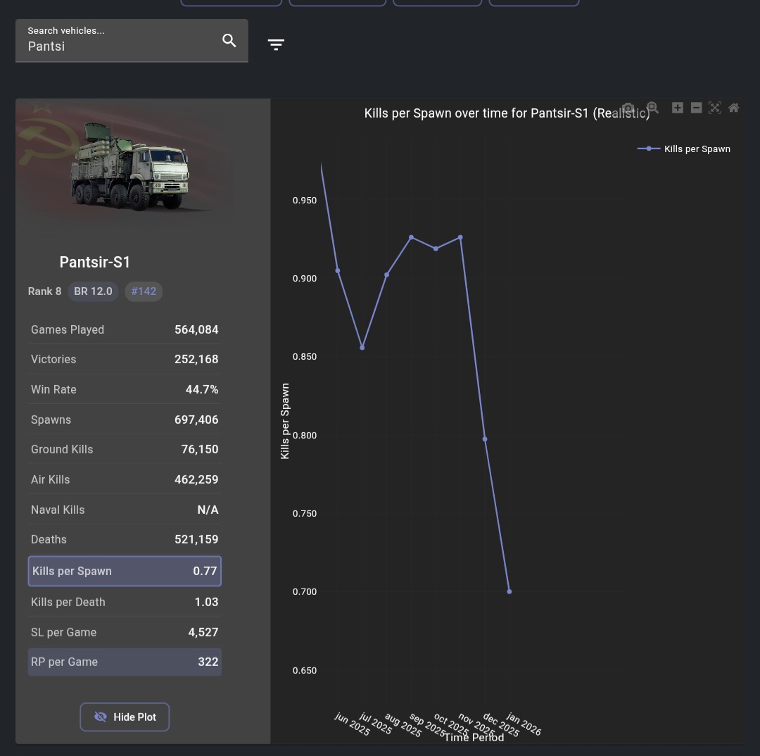 Interesting that in the same time frame the SL per game is steadily increasing. Kinda shows that the Pantsir is not great at killing planes now but seems to do well against A2G weapons