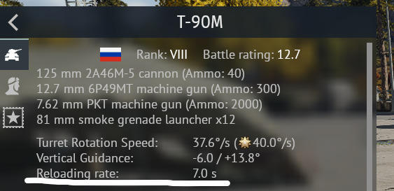 The reload is pretty bad compared to the 5s reload of the IPM1 and the 6s reload of the Merkava Mk.3.