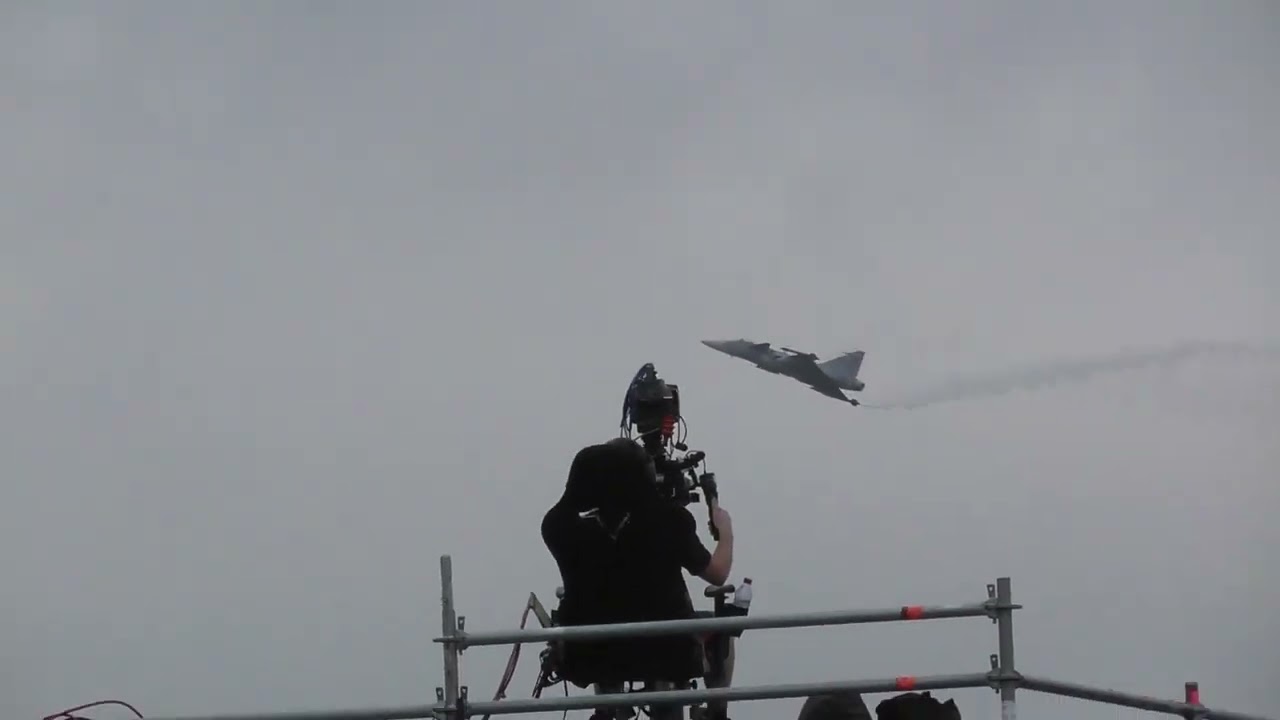 Gripen is losing altitude in the entrance of the maneuver, maintaining speed at loss of altitude. AoA initially is ~35 degrees from picture view or closer to 30 degrees from the actual ground and gets lower as video goes on and he begins to pull out of the maneuver.