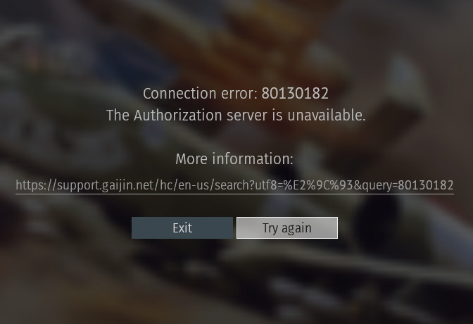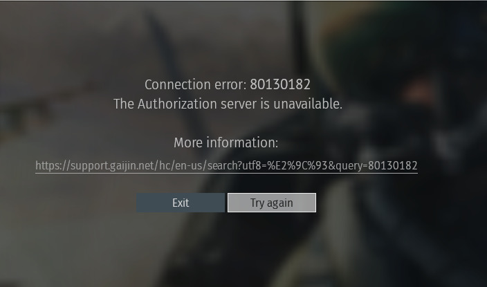 The game shows connection error 80130182 : “The Authorization server is unavailable.”