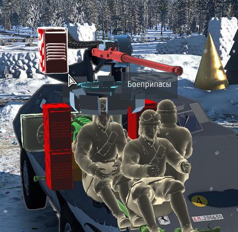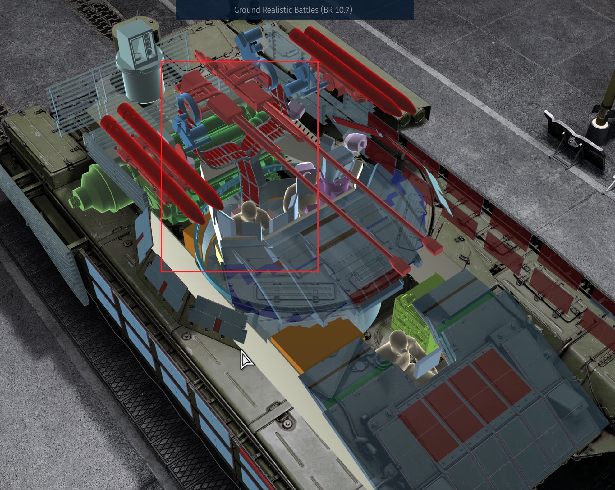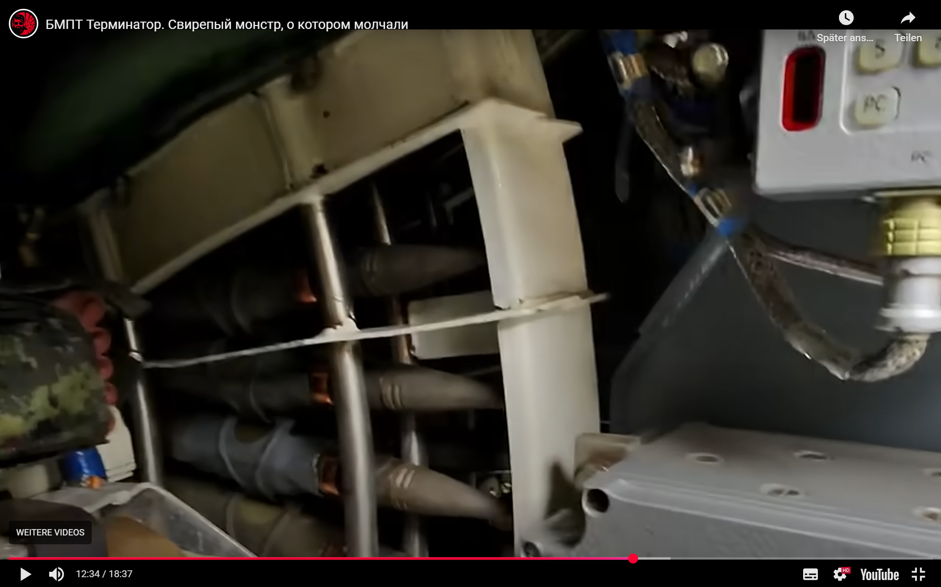 • BMPT, BMPT-72 — when external 30 mm cannon ammo catches fire, the cannon breeches, autoloader and vertical drive will be destroyed. The belt between the cannon breeches and main ammo stowage in the crew compartment is what’s considered to be external ammo.