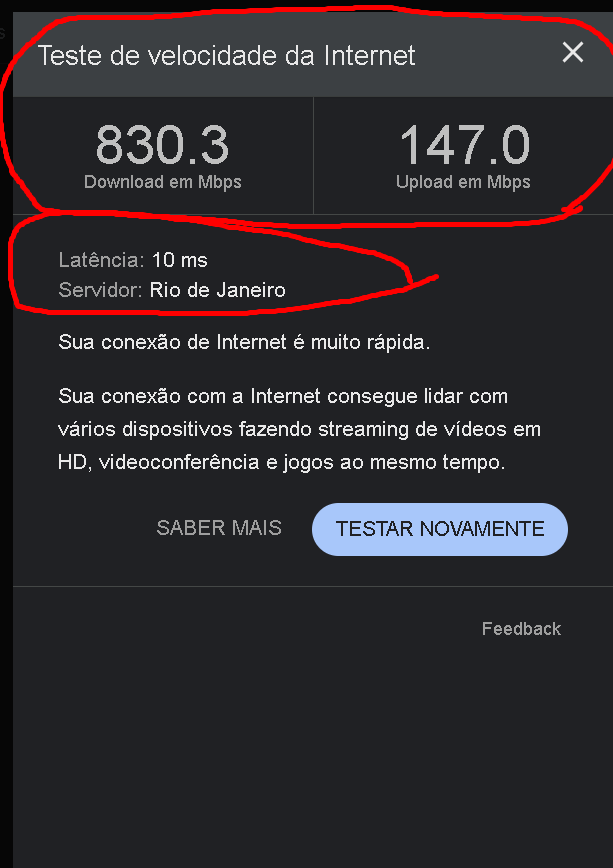 The speed test shows that I have 830 Mbps download speed per second, with 147 Mbps upload speed per second, which makes it impossible, even when playing with European or American servers, for me to stay above the acceptable ping limit. On the American server, I usually get between 140 PING, and on the European server, I usually get between 180 and 200, or 230 on rainy days.