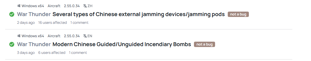 an example, my old issue about Z-10ME missing AG300A/M ands 19 rocket pod, it’s about Z-10me missing something so it’s a “bug”