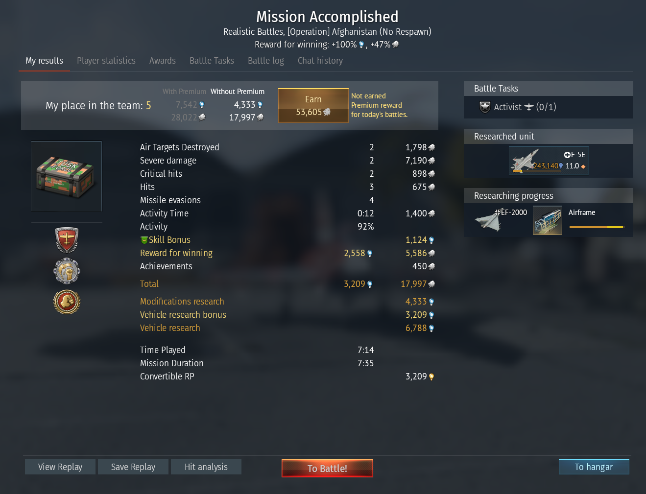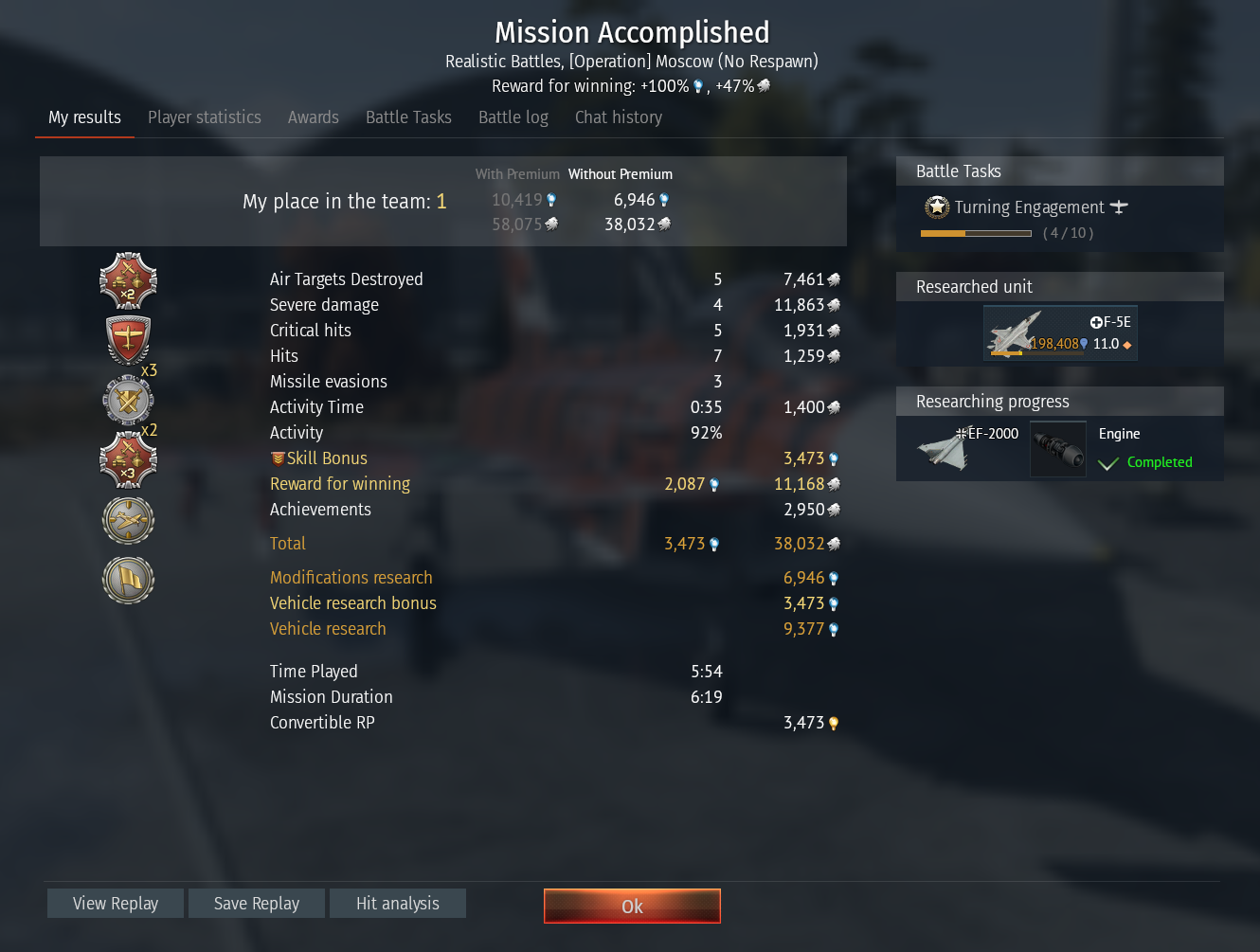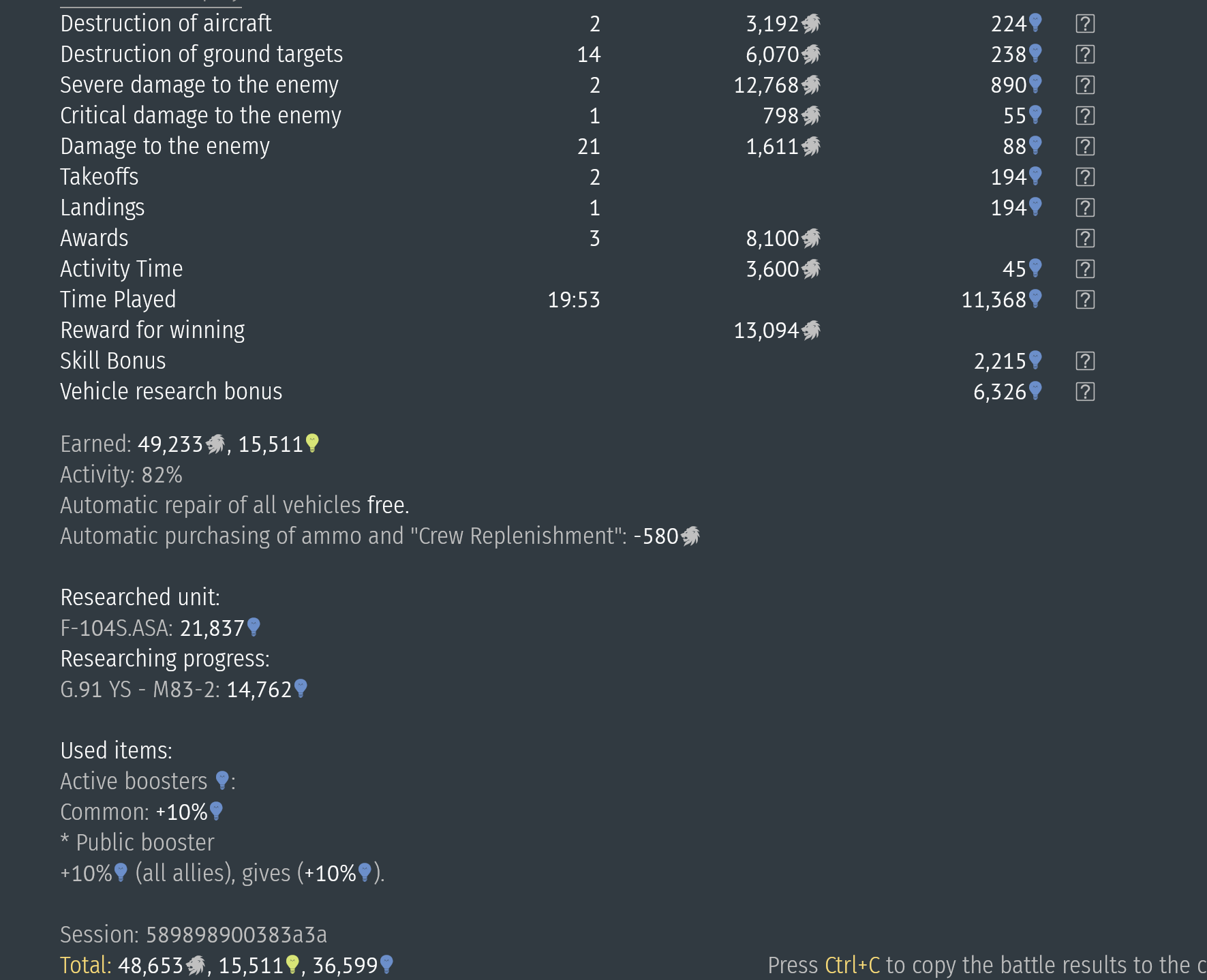 Edit: G91YS with 2 aircraft, 14 ground units destroyed, 20 minute match: 738RP per minute, and 2432SL per minute. For 49,233SL and, 14,792RP.