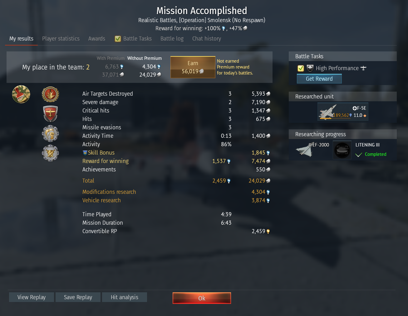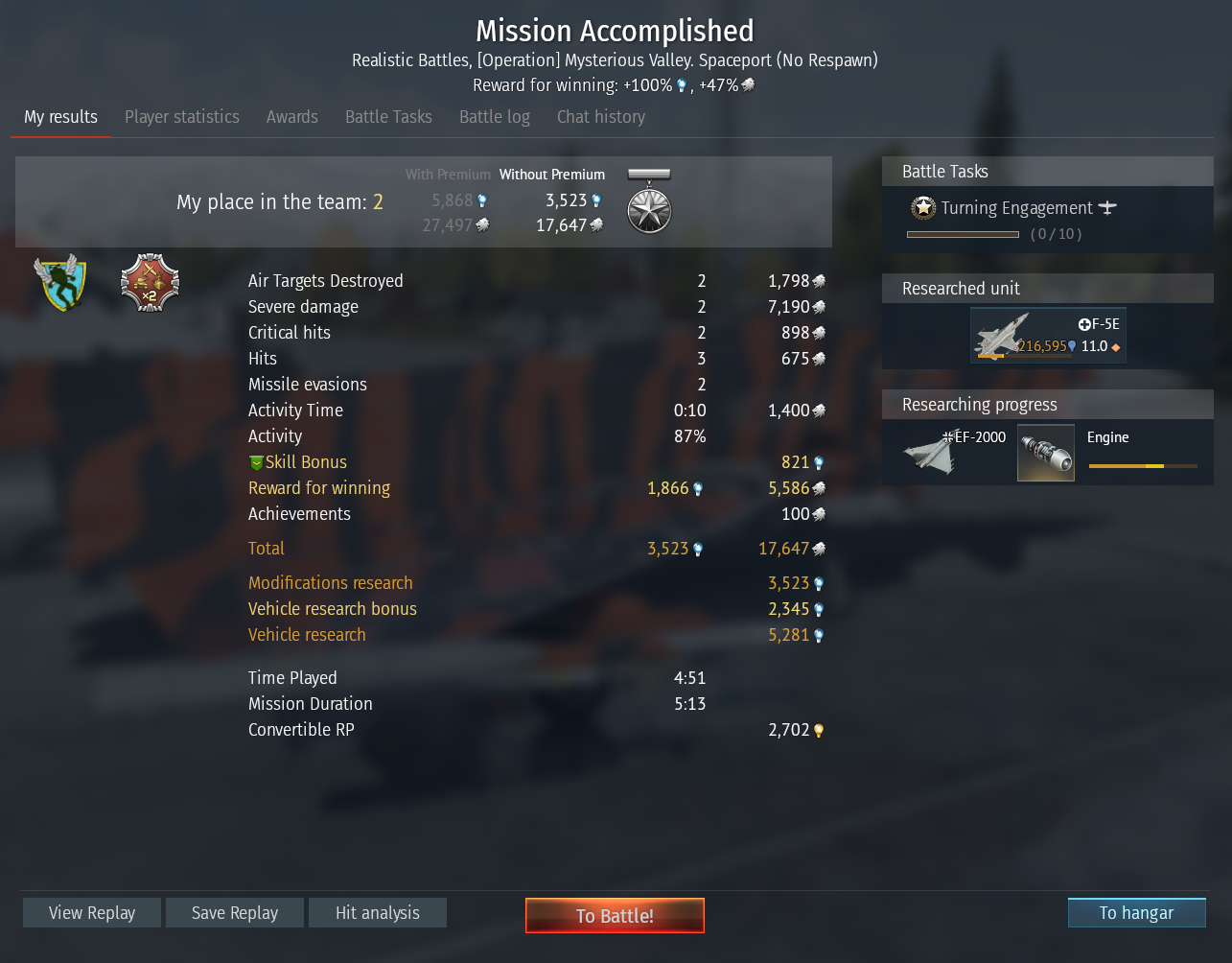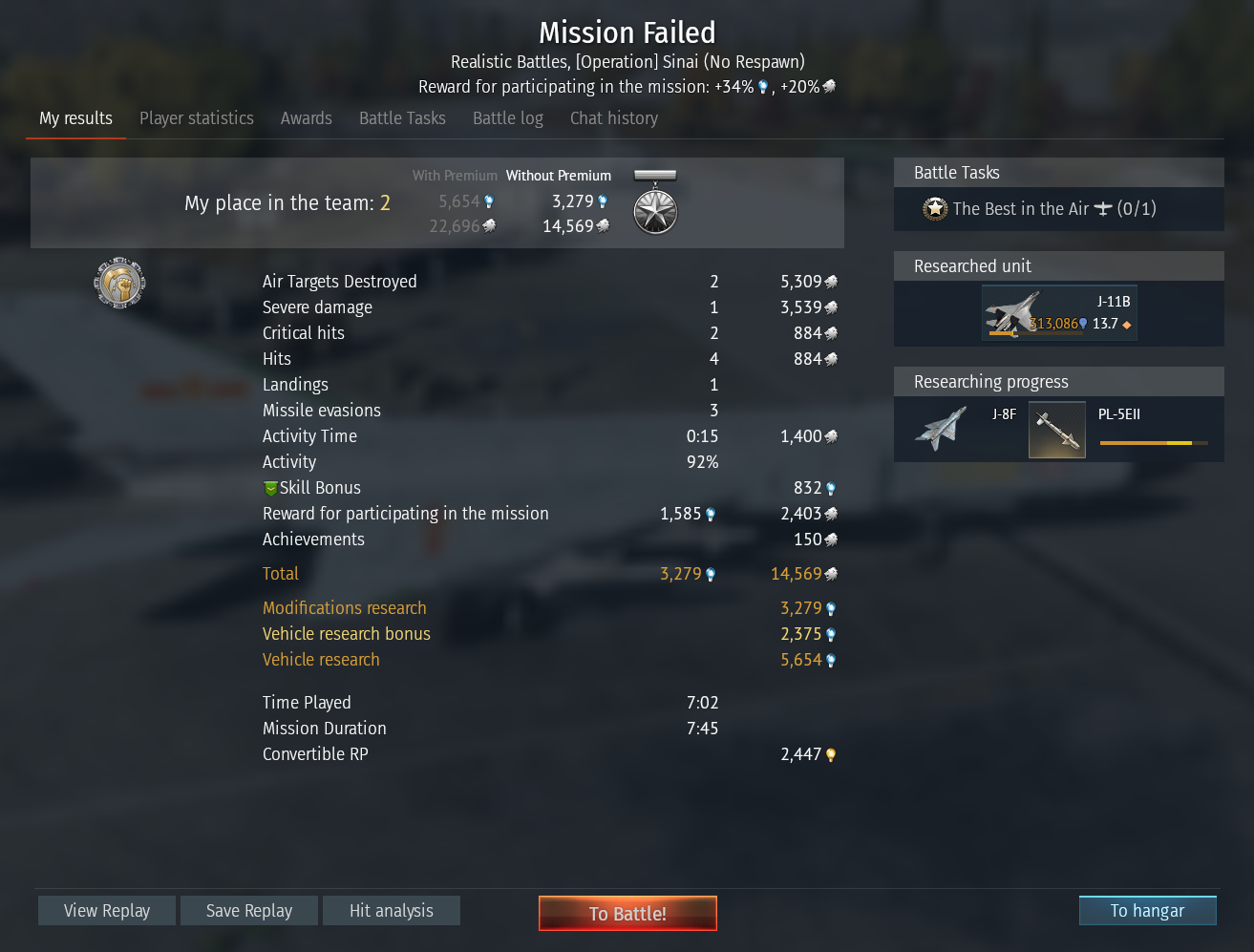 Edit: G91YS with 2 aircraft, 14 ground units destroyed, 20 minute match: 738RP per minute, and 2432SL per minute. For 49,233SL and, 14,792RP.
