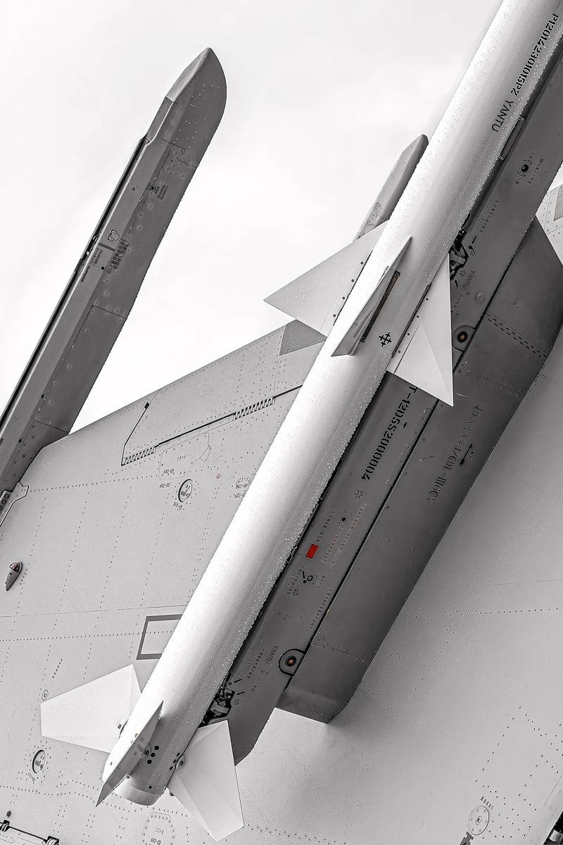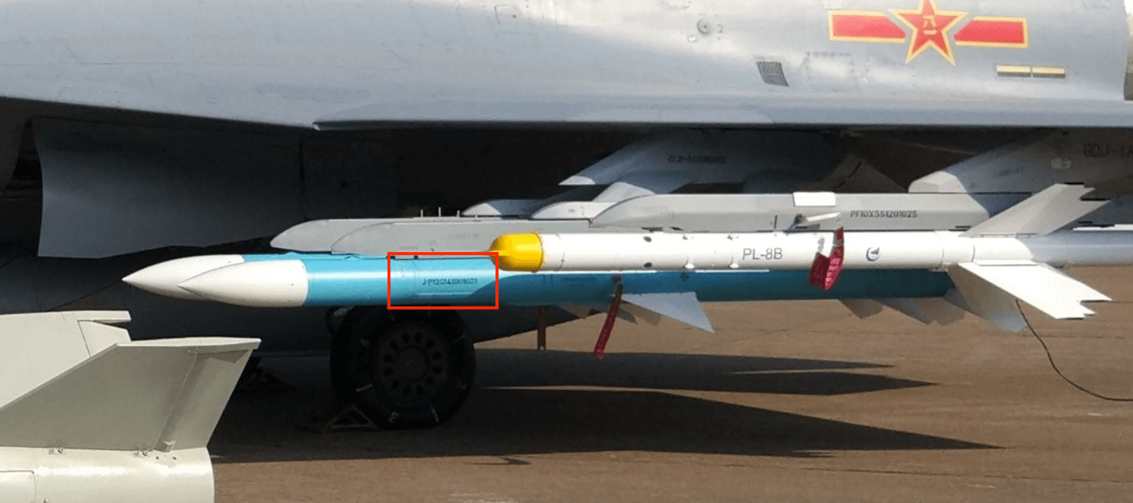 I have found several reference images of PL-12 training rounds. I suspect that, due to sharpening and AI-based enhancement applied to the low-resolution image, the serial numbers on the forward section of the missile body were distorted and appear as a horizontal stripe.