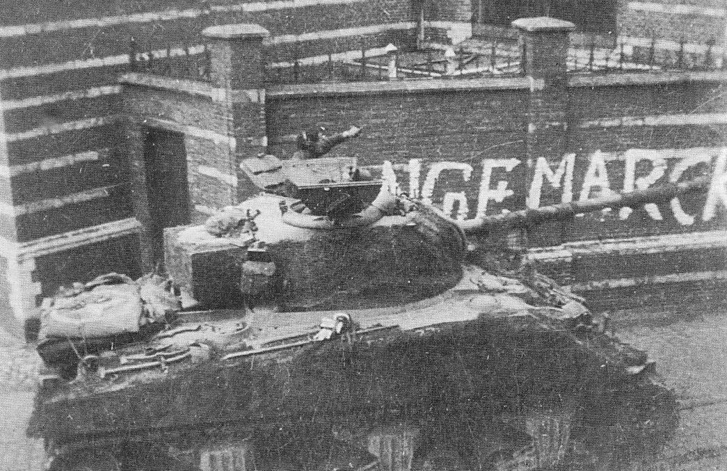 Cpt. Stuart Hills’ Troop enters Geel market square. Up front are the Fireflies of Sgt. Stan Nesling (Right - Mk. IC) and Cpl. Cyril Burnet (Left - Mk. IC Hybrid) with Hills’ Mk. III at the back.