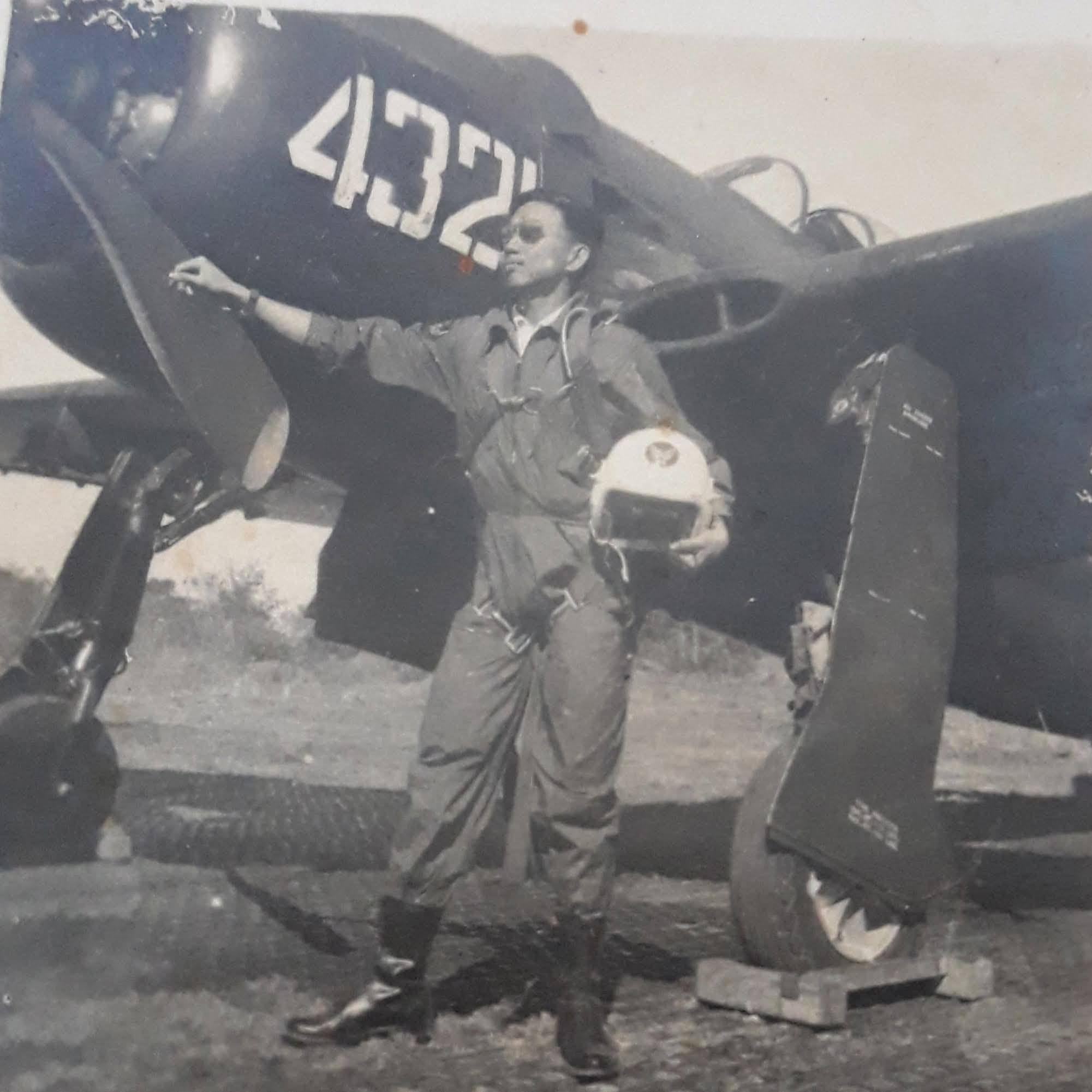 Boontham Punyathalang (pilot) at Wing 4, Takhli District, Nakhon Sawan Province, with a Thai F8F Bearcat aircraft, 1954