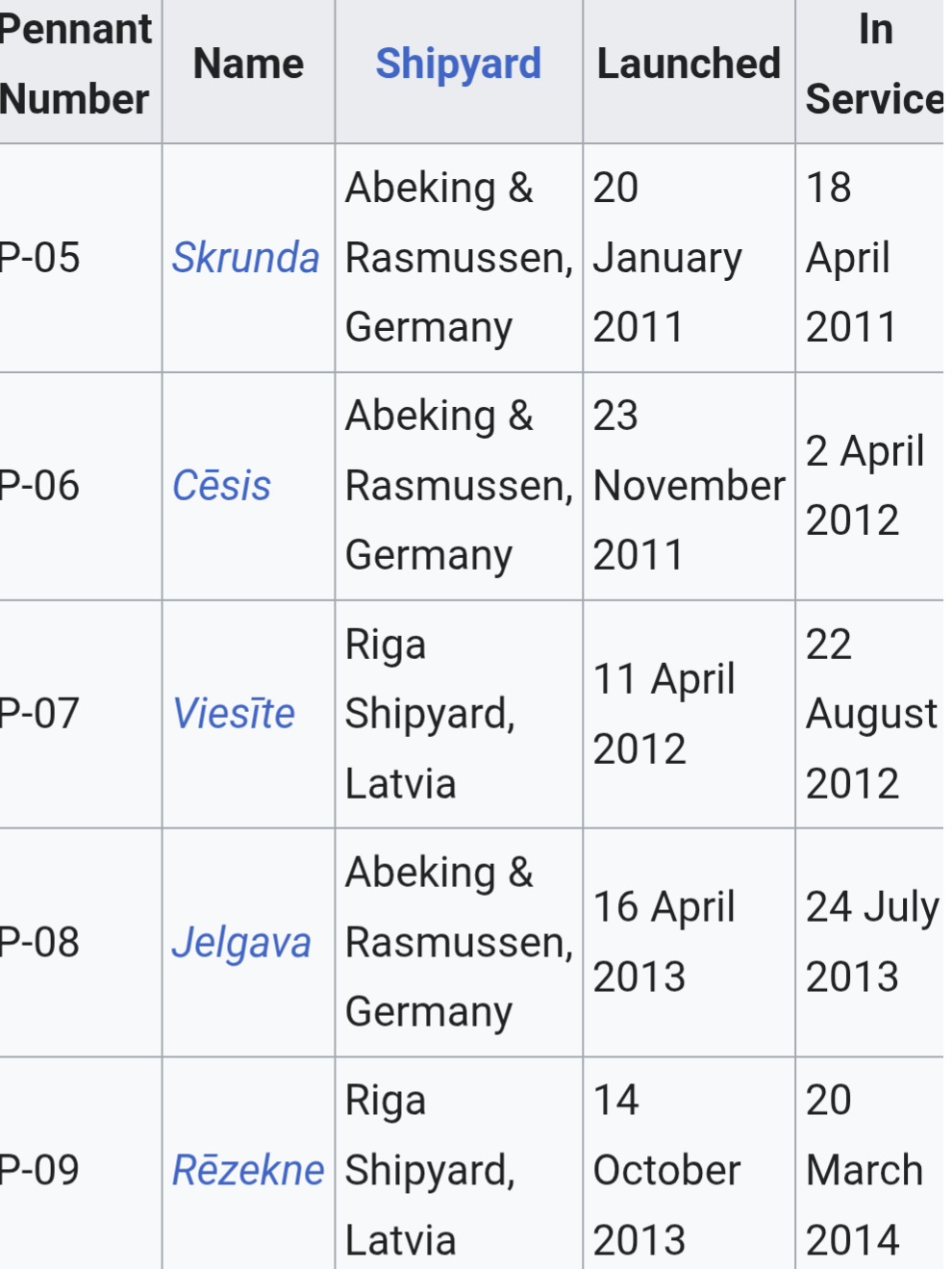 Initially, the first 3 vessels were built by Abeking & Rasmussen (Skrunda, Cēsis, Viesīte) while the last 2
