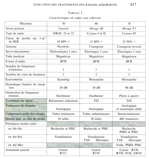 Regarding the Thomson-CSF RDI radar, the same paper states that it supports three pulse repetition frequency modes: BFR / MFR / HFR (Basse / Moyenne / Haute Fréquence de Répétition; Low / Medium / High Pulse Repetition Frequency) This configuration indicates that the RDI is a full-waveform Doppler radar with all-aspect lock-on capability.