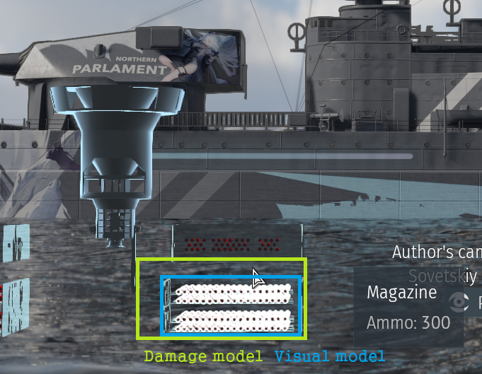 However, in the soyuz case, as presented in my picture shooting the area where you argue the damage model exists beyond the visual model, the shell explodes before reaching the magazine, and as a result only damages the magazine with the explosion. Based on that we have two possible scenarios, as follows: