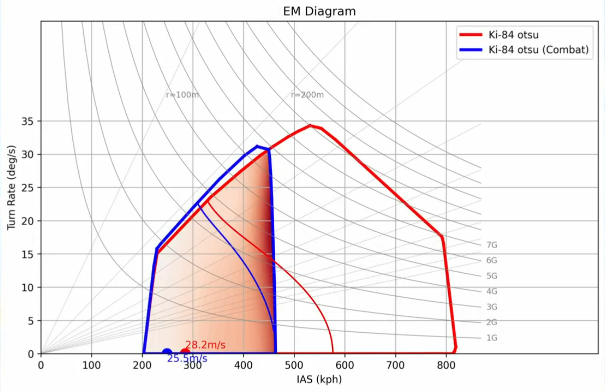 It looks like pretty close to Spitfire MK14 when it is using combat, and also takes off flaps. considering the enigne power is simliar and the KI84 is lighter than MK18( 300kg), spitfire is easiler to lose energe