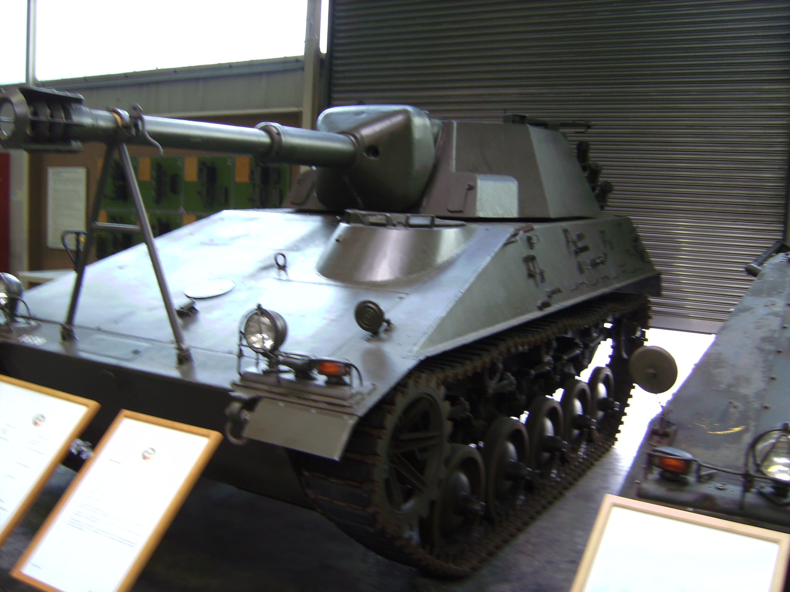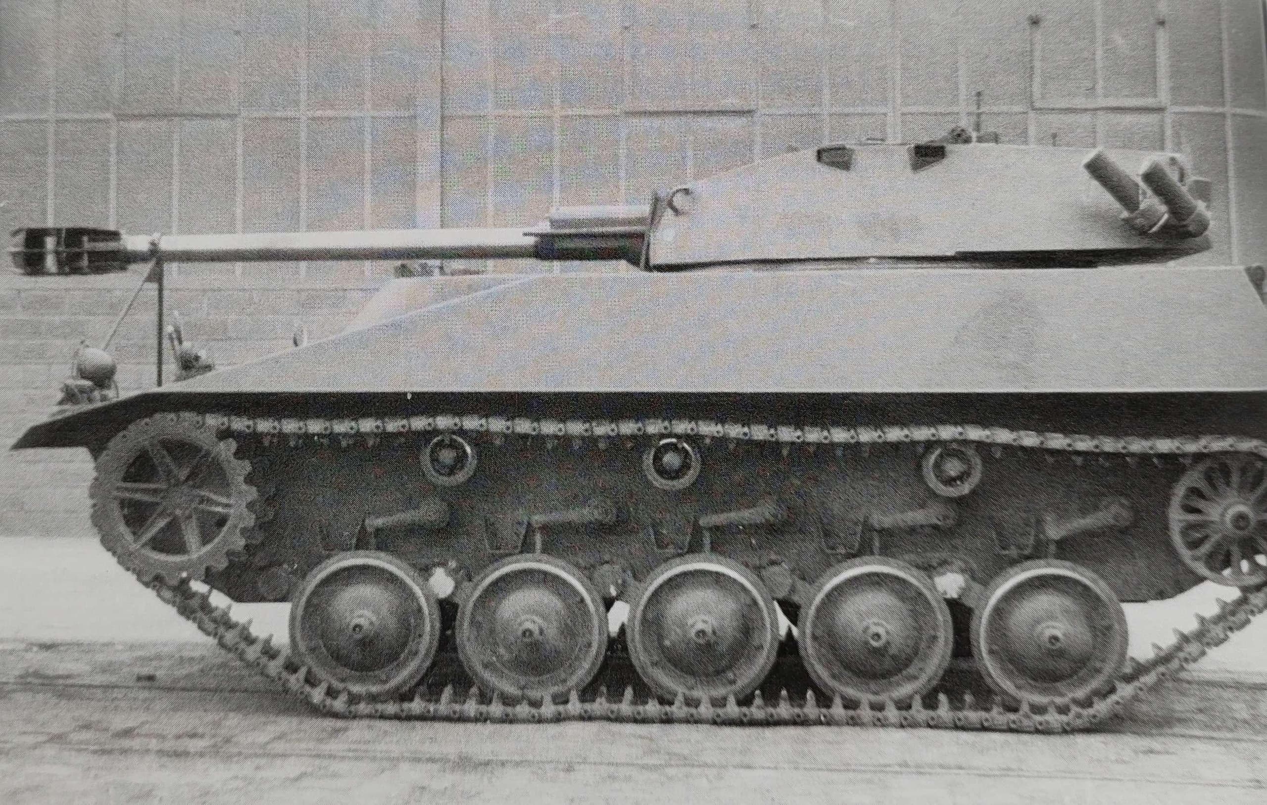 The gun now features a large mantlet, increasing what little protection the crew would have. The gun also has a coaxial machine gun, as is necessary for scout and recon groups. According to available sources, the space in the turret was still not much to allow for comfortable loading, hence the turret was fitted with an 18-round autoloader system, which moved along with the gun. The rectangular hatch on the turret roof seems to have been made for this very reason to allow for the 8 degrees of depression (by moving). More rounds may have been carried in the hull. The small sliding hatches on either side of the mantlet are of an unknown purpose, but perhaps they were used to mount something?