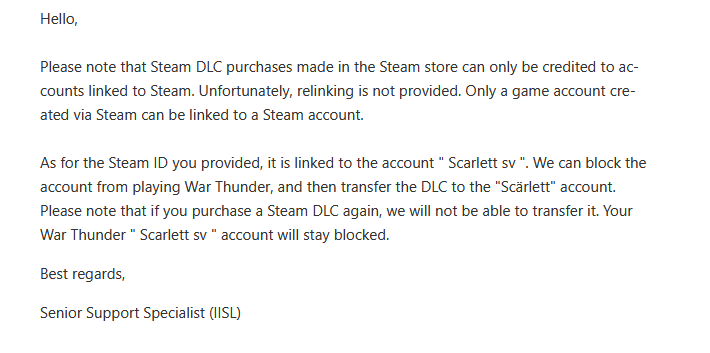 I bought a Steam DLC and it went to the account that was created automatically when I downloaded the game on Steam, on the account there is literally one game played and i really dont know why and when. I tried contacting support but I didnt get any answers as of now and Im scared that I will loose my money. The DLC I bought was the CF-188A Hornet Pack and Im scared that they will not do anything with it because of the premium that is in that pack.