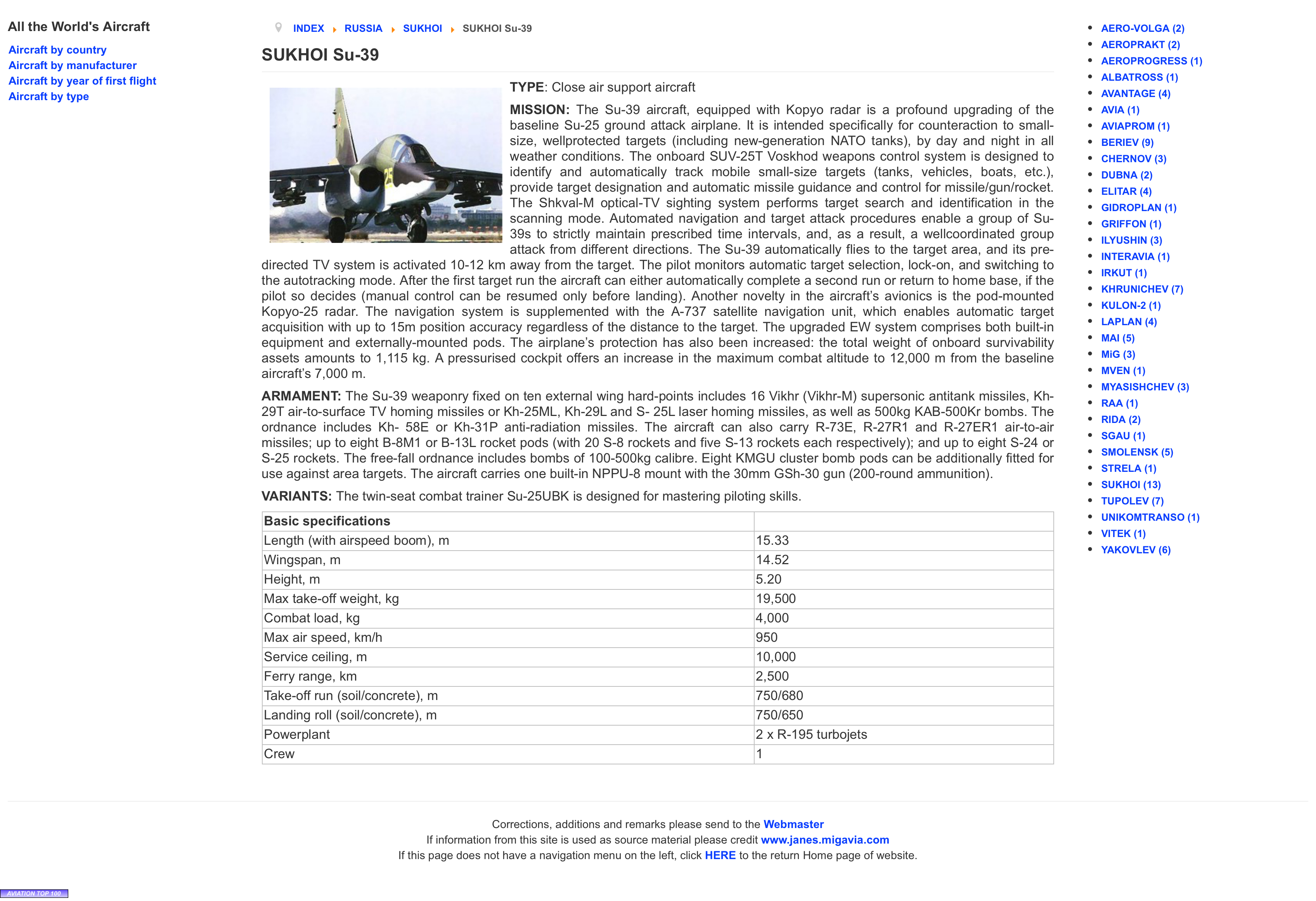 [1] Jane’s All the World’s Aircraft 2003–2004, Jane’s Information Group. ISBN 0-7106-2537-5 (link: SUKHOI Su-39)