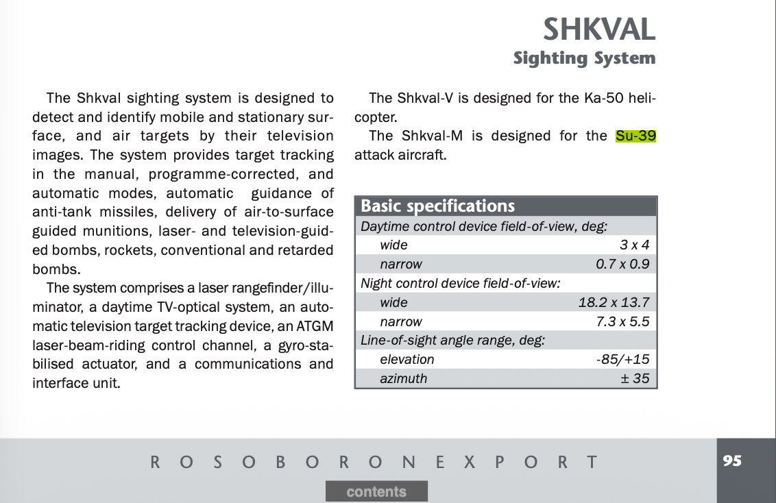 Based strictly on published specifications in Jane’s All the World’s Aircraft 2003–2004 [1], the U.S. Army TRADOC Worldwide Equipment Guide: Air and Air Defense Systems [2], Sukhoi Su-39 : Sukhoi [3], which its contents are supported by “Aerofax: Sukhoi Su-25 Frogfoot: The Soviet Union’s Tank-Buster” [3’], and “OKB Sukhoi: A History of the Design Bureau and its Aircraft” [3"] and an official report made by Rosoboronexport’s “Aerospace Systems Export Catalogue” [4], the current in-game representation of the Su-39 (Su-25TM) in War Thunder does not fully reflect the aircraft’s documented weapons integration capability. While the game correctly models Kh-25/Kh-29 variants, 9K127 Vikhr (However, not the Vikhr-M) missiles, KAB-500Kr, standard unguided bombs and rockets, and short-range air-to-air missiles (R-73 and R-60M) — all consistent with published references [1][2][3][3’][3"][4] — authoritative sources further describe the Su-39 as compatible with radar-guided medium-range air-to-air missiles, R-27R1/ER1 and R-77, enabled by the Kopyo-25 radar suite [1][2][3][4], 4 external pods of SPPU-678 pod with GSh-30-1 cannon[2][3], as well as anti-ship (Kh-31A) and anti-radiation (Kh-58E) missiles forming part of its expanded multi-role strike and SEAD capability [1][2][3][4]. Moreover, it retained and improved the Shkval of Su-25T, to the Shkval-M: an Optical-TV sight system with night/all-weather capabilities, while also installing the Khod thermal imager, and a 23X image magnification aiming system (to 25 km)[2][4]. The omission of these documented radar-guided AAM, anti-ship, and SEAD munitions results in a configuration that aligns more closely with the Su-25T rather than the fully realized Su-39 standard described in professional aviation literature.