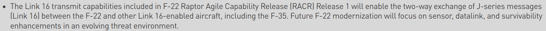 your wrong. the f22s radar has more TRM’s gen 3 aesa tech which includes things such as anti jamming, jamming, LPI, clutter filtering etc + being more powerful making it the strongest on a fighter. and it can share data link with other aircraft its the worlds first fully data fusioned fighter it can send that data to other f22’s via IDFL, MADL (as seen in this link page 53 (MADL retention) + link 16. f22 uses scorpion HMD. su57 doesnt have 360 radar coverage either.