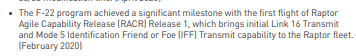 The F-22 has a stealth datalink while the F-35 uses Link-16. To overcome this, they have been using the U-2 as a translator aircraft. I think they later gave the F-22 Link-16, but its receive only