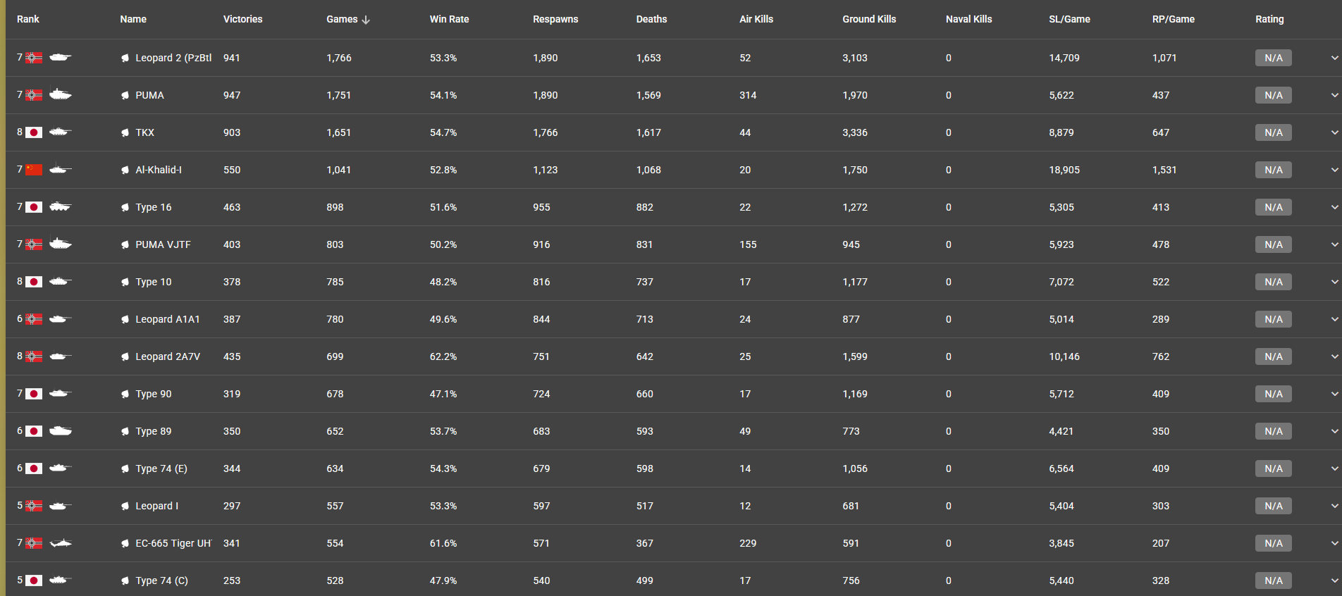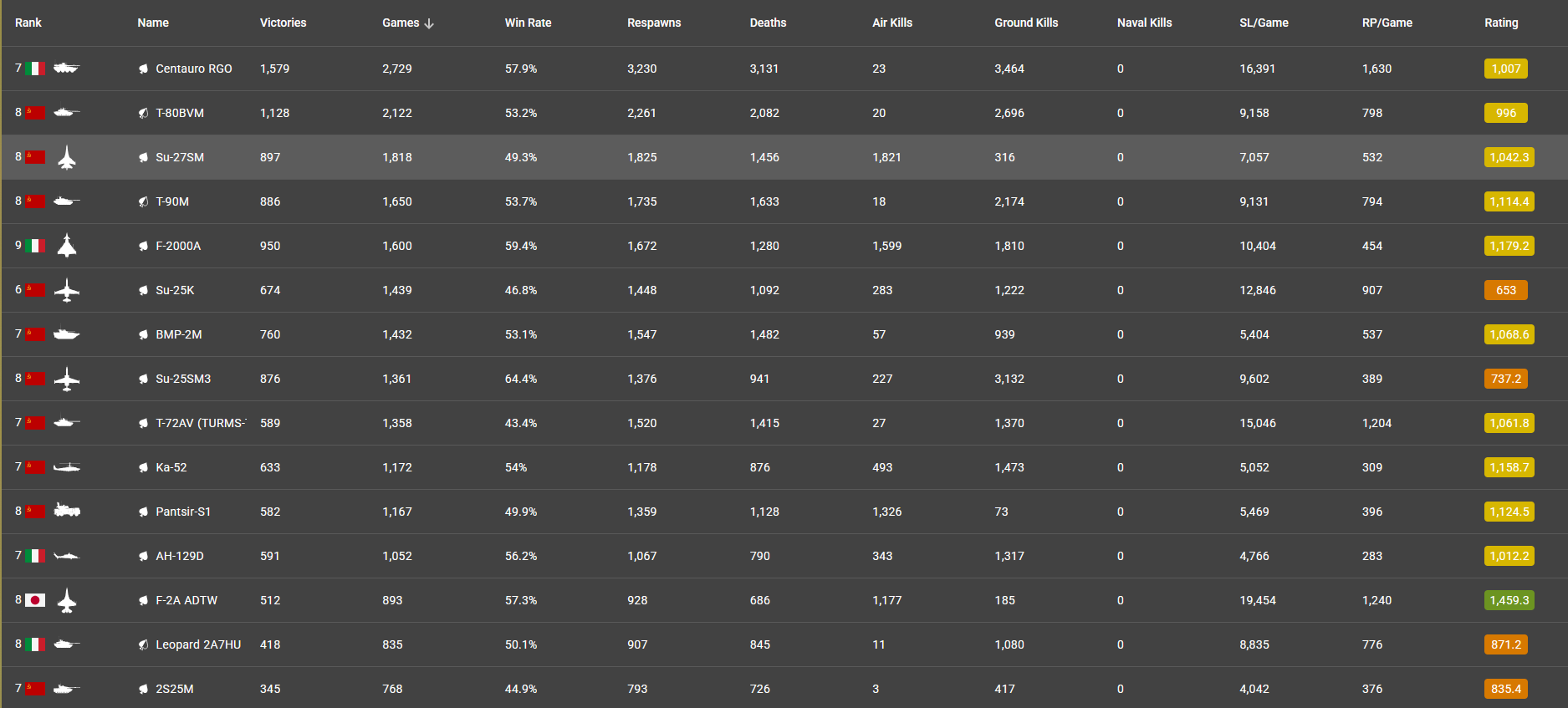 i barely play the eurofighter and only use it when i feel like i wanna play air a bit, if you wanna go for KDR, u cant talk about the average KDR per vehicle, specially on your ground vehicles, because they dont go past .16, for comparison i barely play any air to air vehicle just cuz im not too interested in that, this is my KDR for what i use the most