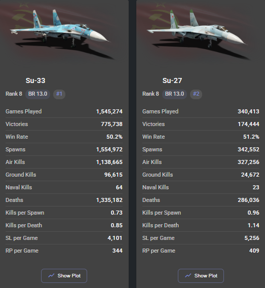I don’t know what statistics they’re looking at, because while the SU30MKK and MK2 maintain their statistics, most of the 13.0 versions have a drop in their statistics.