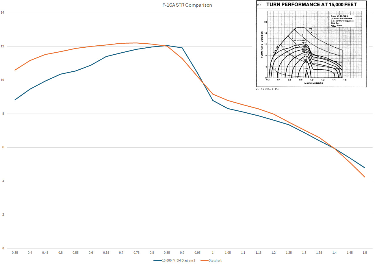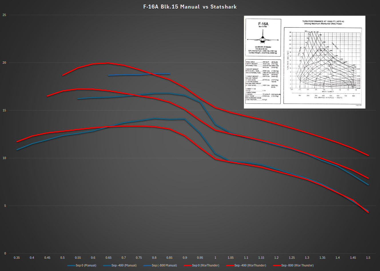This is a comparison between a different F-16 EM Diagram and the War Thunder values. It’s turn performance past Mach 1.0 is accurate but it’s turn performance below Mach 1 is inaccurate. It underperforms in this case at high subsonic speeds and overperforms at low subsonic.