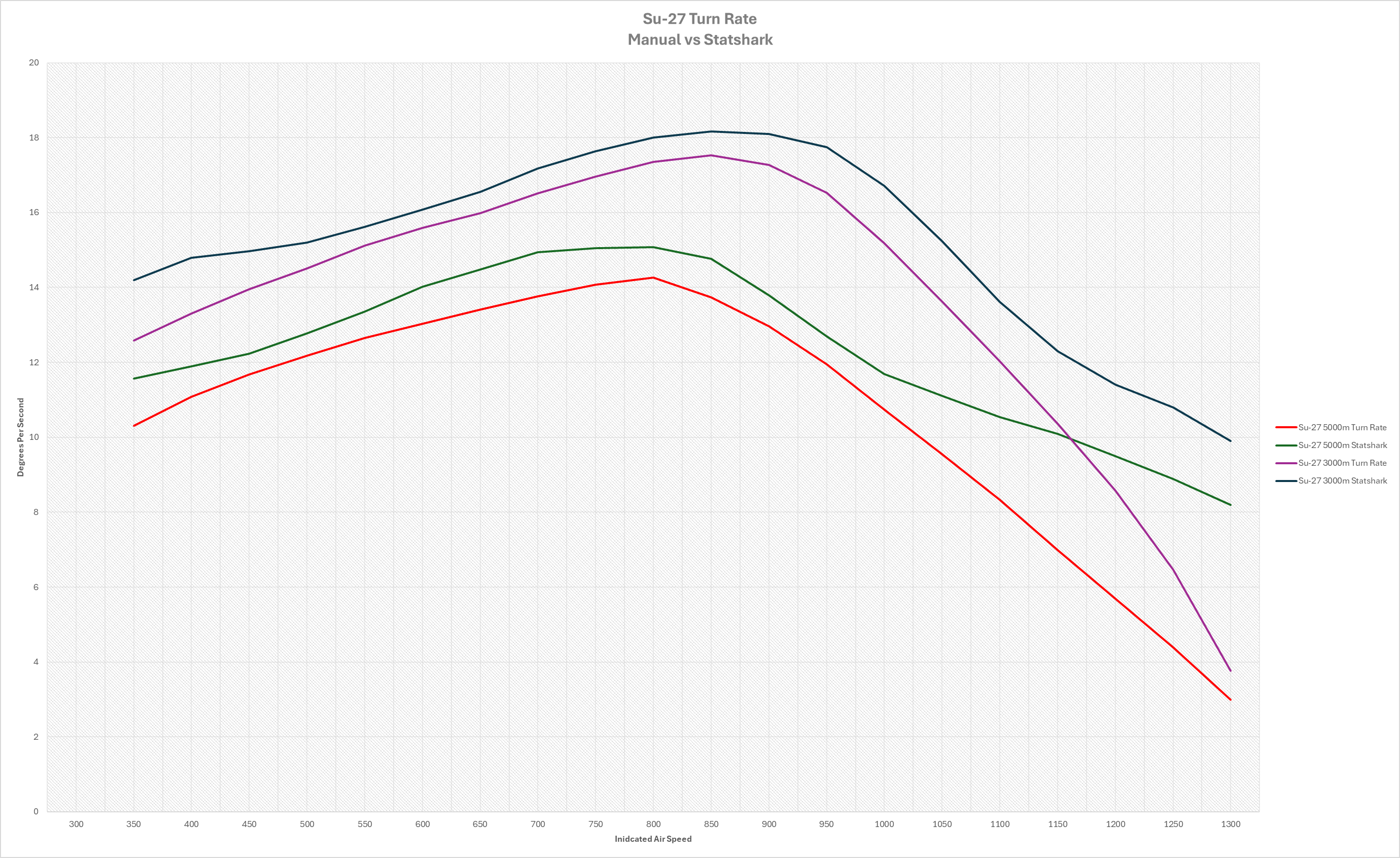 This is a comparison of the turn rate numbers that can be found in the Su-27SK Flight manual vs Statshark turn rate numbers. It should be noted that Statshark numbers in this case might be understated by 1/2 degree per second as well which would skew the overperformance points even further.