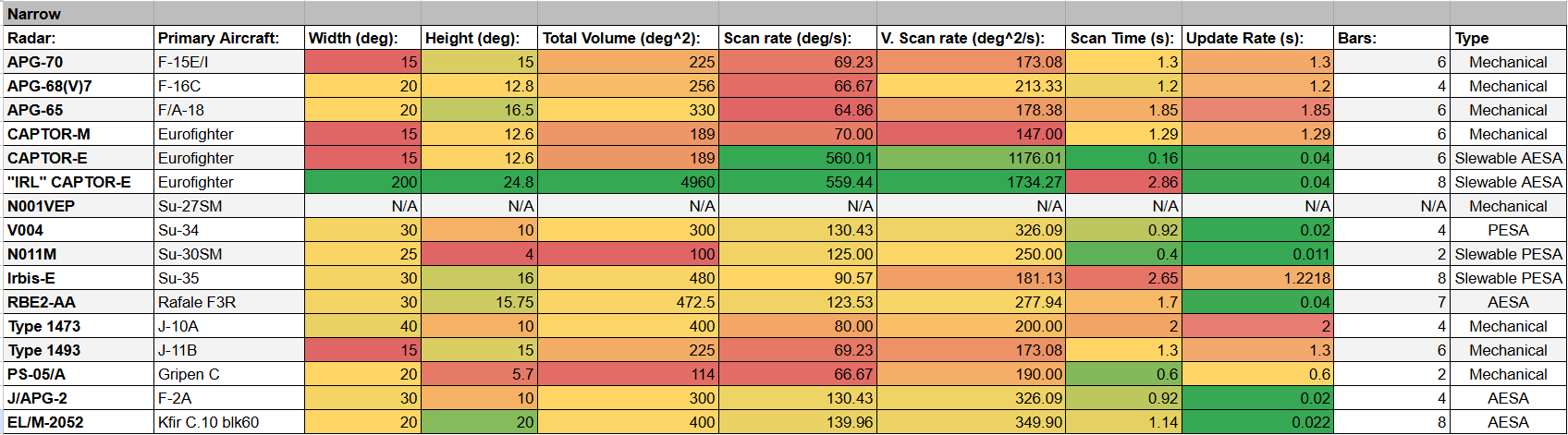 Large search volume isnt really what you want from a narrow scan. Narrow scan should prioritize minimized scan time with maximized scan height. The point of the narrow scan is to quickly find a target in elevation that you’ve already located in azimuth, typically due to an RWR spike.