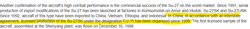 rejoice, the su-27sk history page on the official UAC website states that j-11 are license produced su-27sk